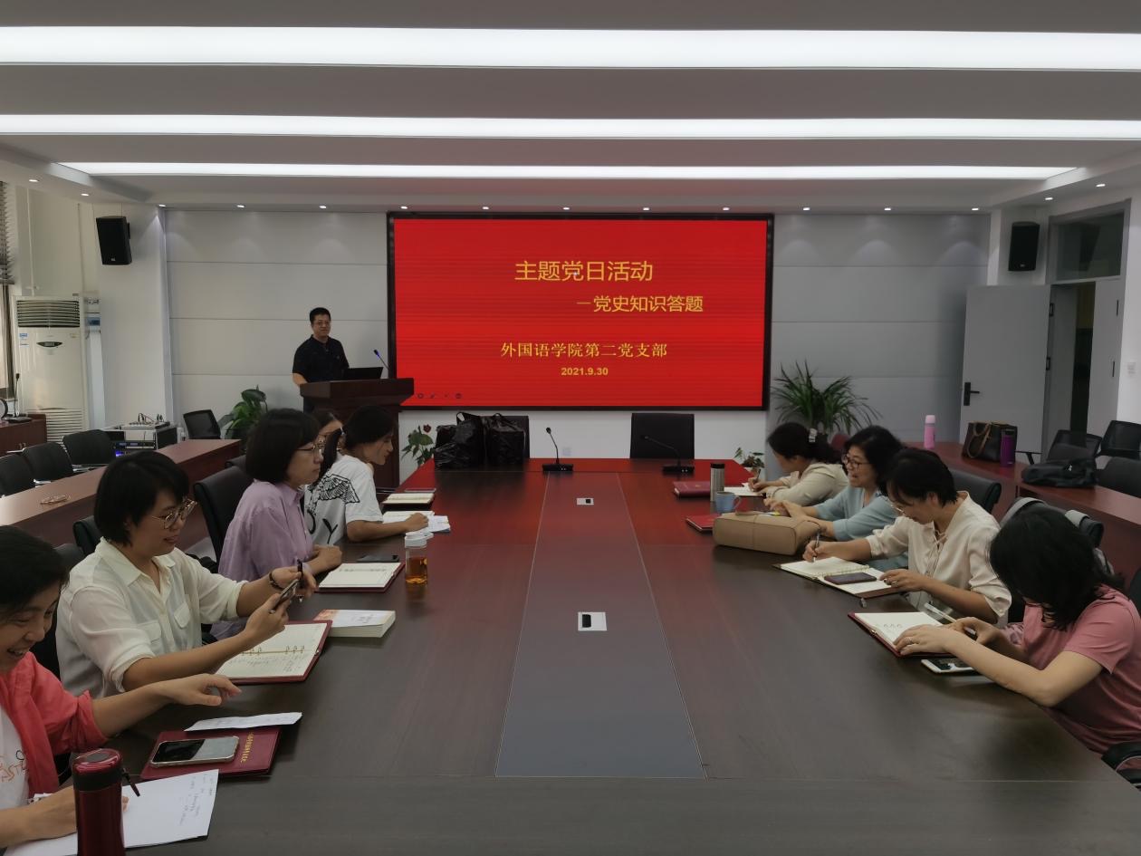 为庆祝中国共产党成立100周年,深入贯彻落实习近平总书记关于“学党史、悟思想、办实事、开新局”重要指示精神,进一步提升党员政治理论水平、强化党性教育、创新党章党史知识学习的方法和途径。9月30日下午,外国语学院第二党支部开展了“党史知识竞赛”主题党日活动。