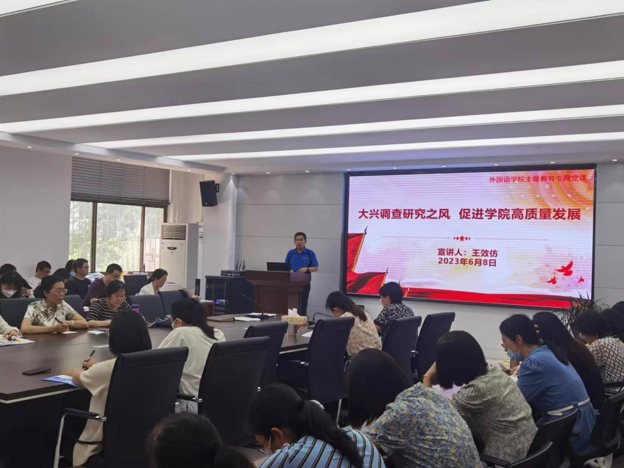 为深入学习贯彻习近平新时代中国特色社会主义思想,扎实做好主题教育和调查研究工作,6月8日,青岛农业大学外国语学院于文经楼C220会议室开展“大兴调查研究之风 促进学院高质量发展”主题教育专题党课,学院党委书记王效仿主讲,学院全体教职工参会。