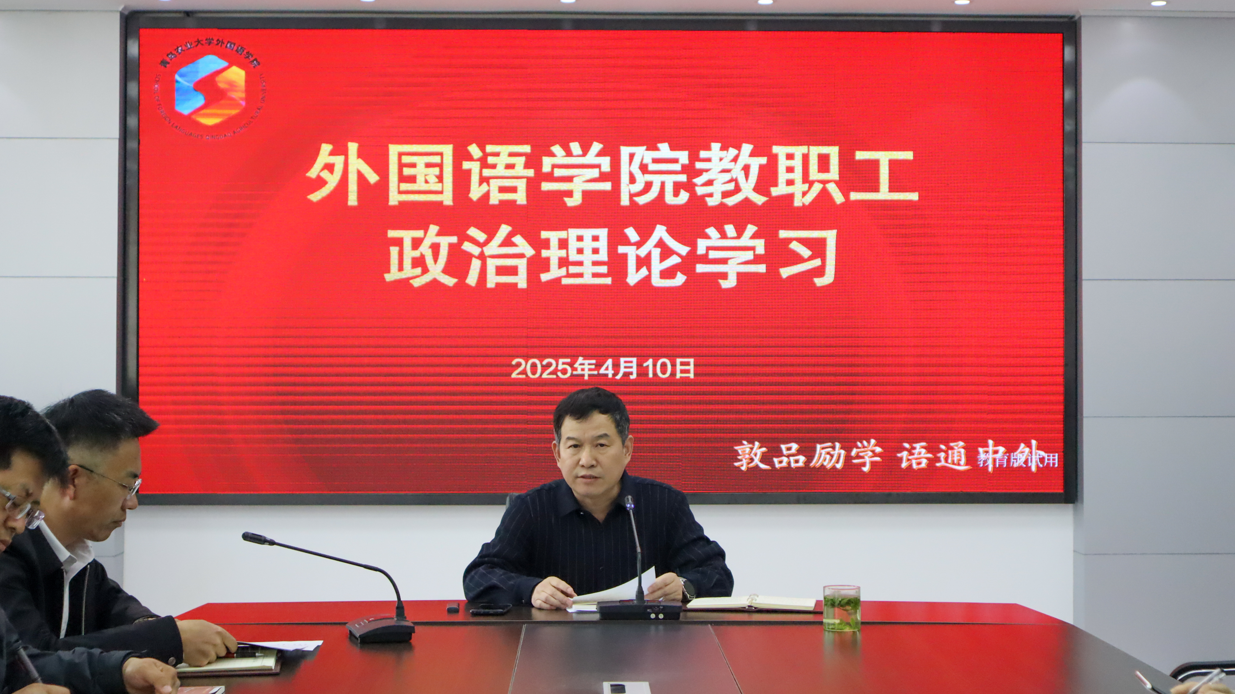 4月10日,外国语学院在文经楼会议室组织深入贯彻中央八项规定精神学习教育专题学习。外国语学院党委书记王效仿以《严格遵守中央八项规定精神 做新时代合格高校教师》为题讲授专题党课,全体教职工参加学习。