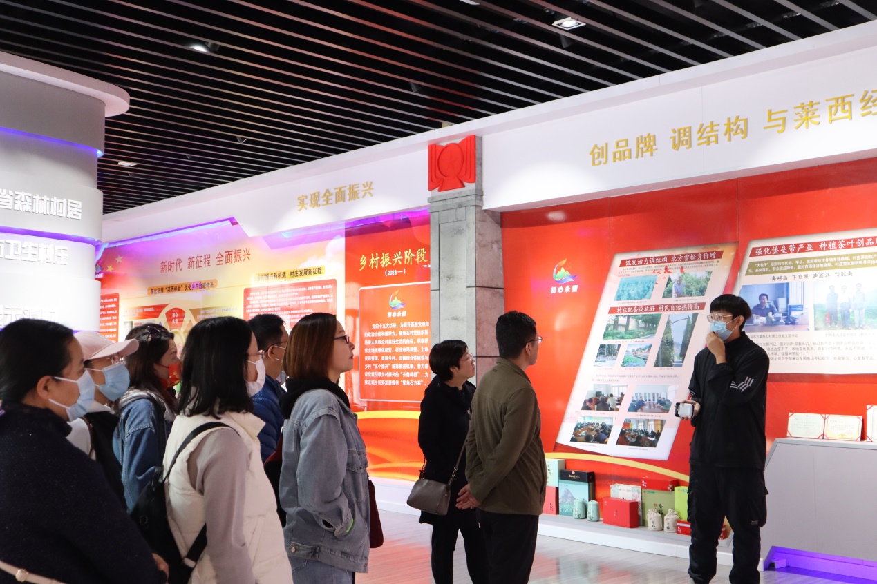 随后,全体党员前往茶田花海游览区进行采茶体验活动。鳌角石村地形多以山地丘陵为主,因不适宜种植庄稼,村民经济来源狭窄,村里一度贫困落后。而该游览区是鳌山卫党工委、办事处依托天柱山登山旅游的优势,将鳌角石村茶叶种植与乡村旅游业进行有机结合后的代表性区域,村庄最终走出了一条富有地方特色的发展之路。体验活动结束后,党员们去往青岛鳌福茶厂进行考察调研。鳌福茶厂是在党工委、办事处的指导、支持下,村庄成立的农产品加工龙头企业,它的设立标志着该村在打造党建引领乡村振兴、创新城乡融合发展机制的“齐鲁样板”中率先迈出了新步伐。