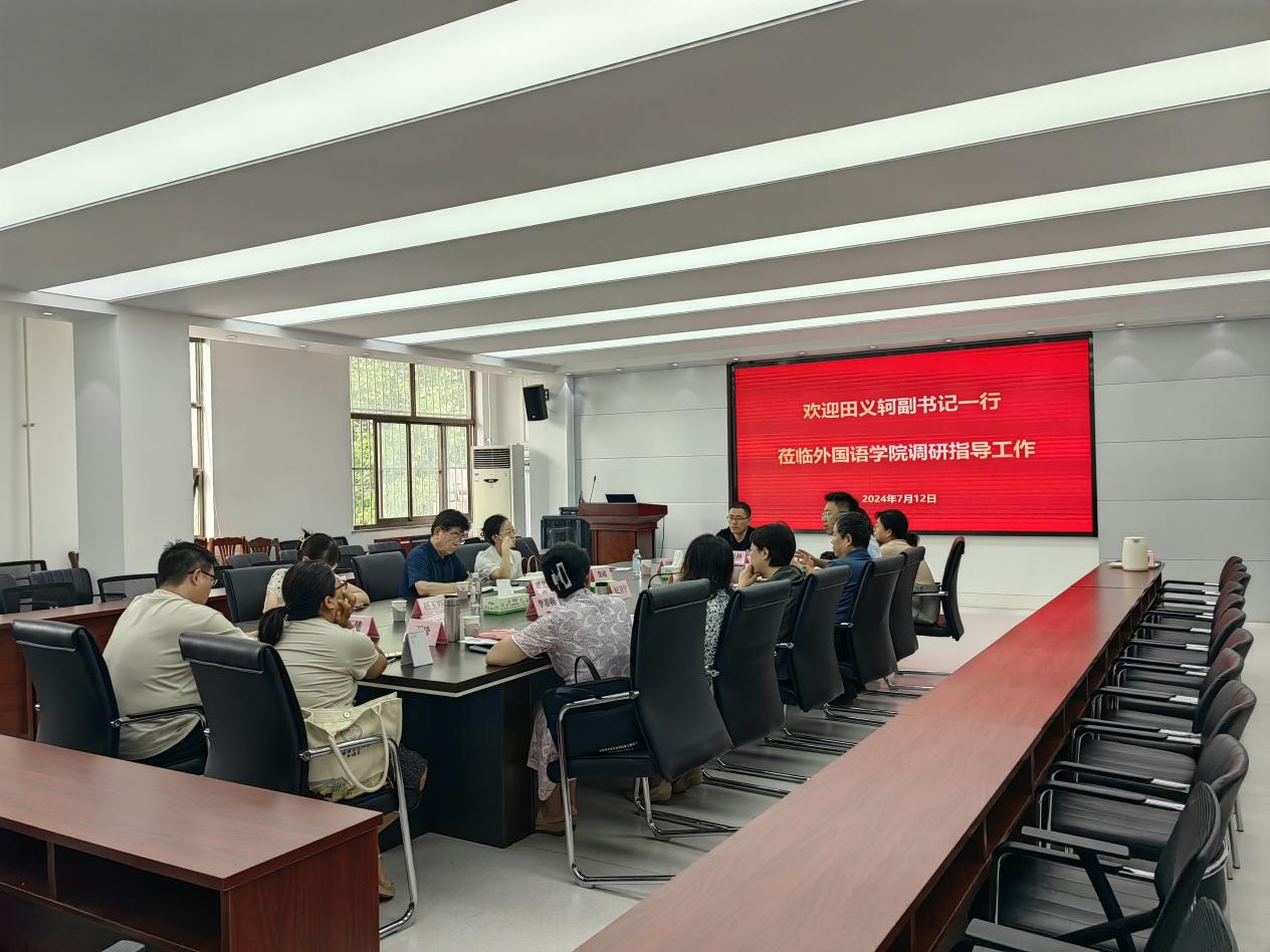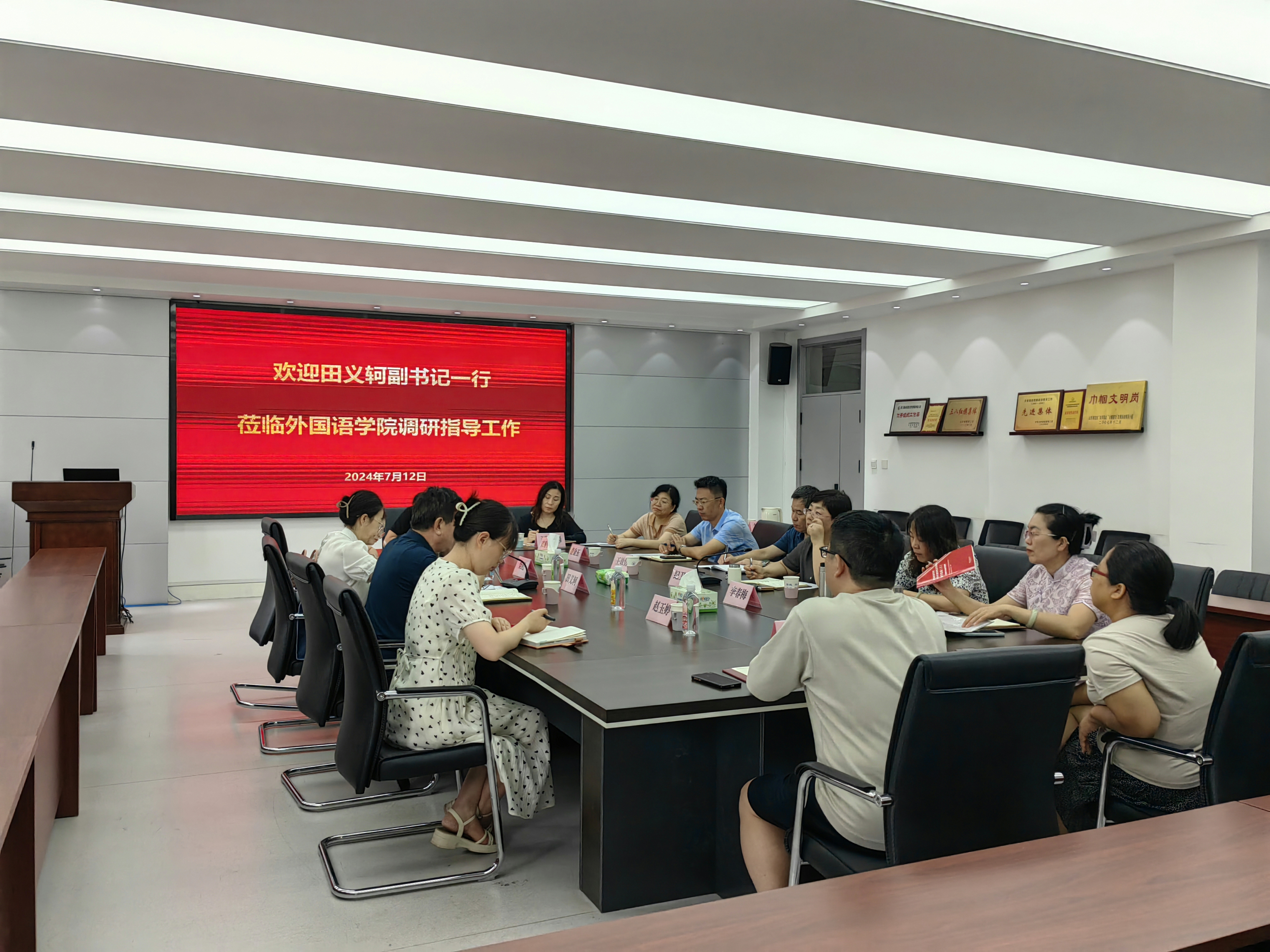 7月12日,校党委副书记田义轲到外国语学院走访调研,指导人才培养工作。学院党委书记王效仿、院长纪卫宁、党委副书记副院长盛金玉等全体党政领导班子成员及各专业负责人参会。