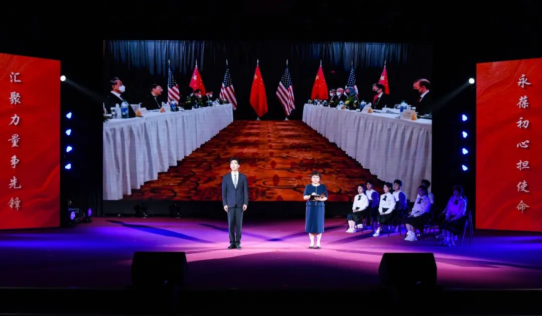第三幕则将目光投向当下,再现中美高层会谈的紧张场景。中国外交官杨洁篪义正辞严的表态,搭配翻译张京精准流畅的同声传译,展现了新时代中国外交官在国际舞台上用智慧与信念捍卫国家尊严、争取话语权的风采,诠释了“先锋”精神在当代的延续。