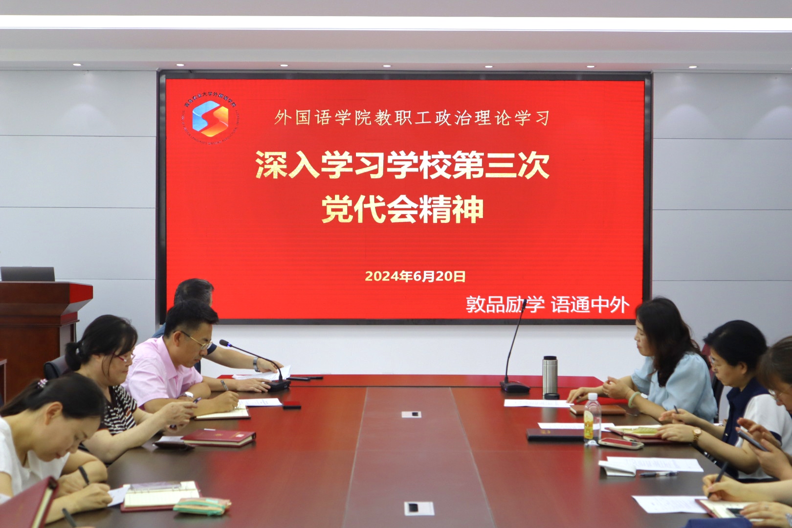 6月20日,外国语学院于文经楼C220会议室开展“青岛农业大学第三次党代会精神”专题学习宣讲,本次会议由外国语学院党委书记王效仿主持,学院全体教职工参加。