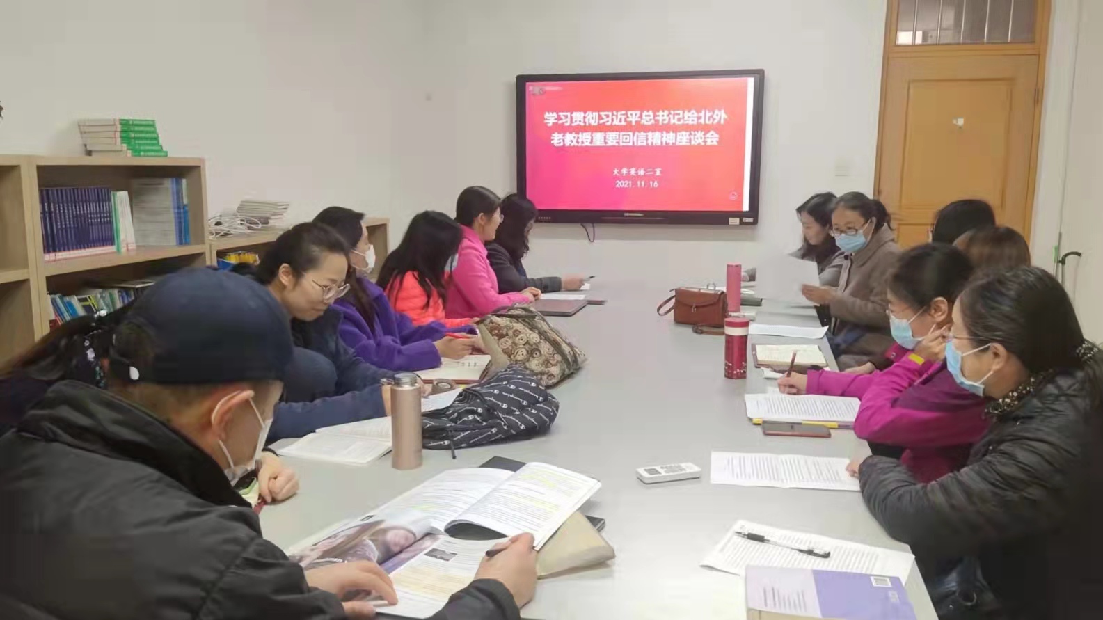 11月16日,外国语学院大学英语二室于文经楼B203召开了习近平总书记给北外老教授回信精神学习交流会。会议由教研室主任聂庆娟老师主持,主要交流学习习近平总书记给北外老教授们回信的心得体会和自我反思,教学工作反思重点围绕教研室集中开展的课程思政教学展开,也明确了下一步课程思政教学努力的方向。大学英语二室全体教师参加了会议。