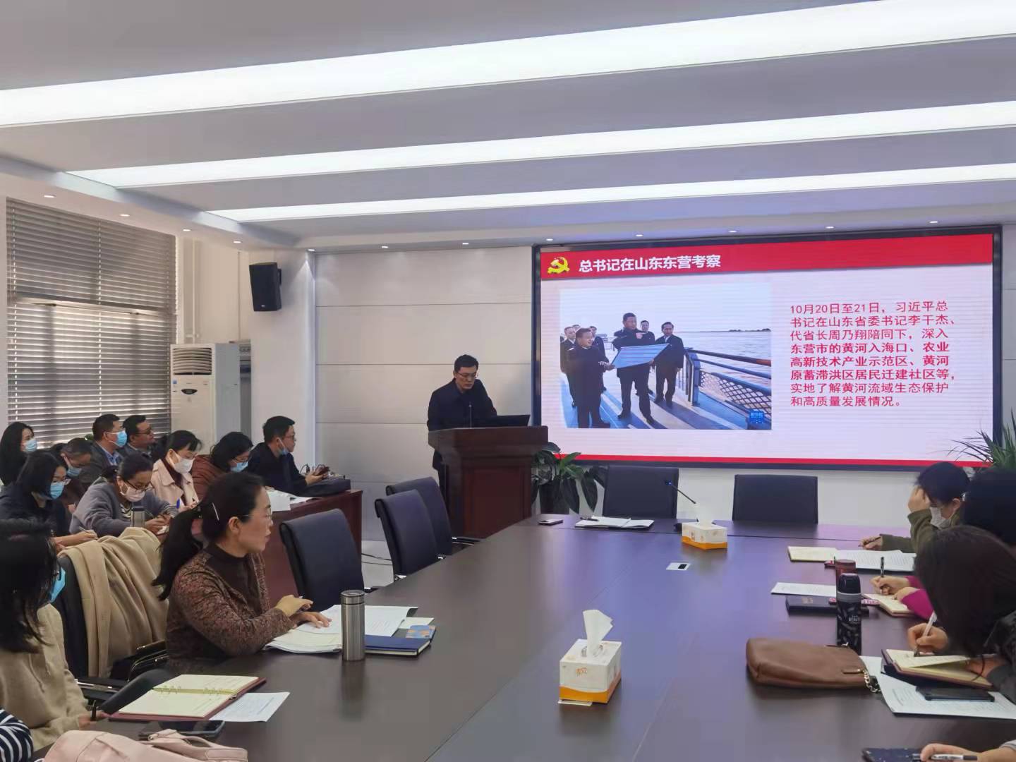 首先,会议以图文的形式向教职工们介绍了习近平总书记在黄河三角洲农业高新技术产业示范区、黄河滩区居民迁建社区、莱州湾胜利油田等地的考察情况。然后,会议重点学习了“深入推动黄河流域生态保护和高质量发展座谈会”的讲话精神。焦磊指出,习近平总书记的重要讲话深刻阐释了黄河流域生态保护和高质量发展的重大理论和实践问题,提出了新观点新要求,立意高远、内涵丰富,体现了高远深邃的战略思考,展现了统揽全局的系统观念,彰显了至深至厚的人民情怀,发出了为黄河永远造福中华民族而不懈奋斗的新号令,指明了前进的目标方向。全体教师要深入学习领会,抓好贯彻落实,以实际行动增强“四个意识”、坚定“四个自信”、做到“两个维护”。