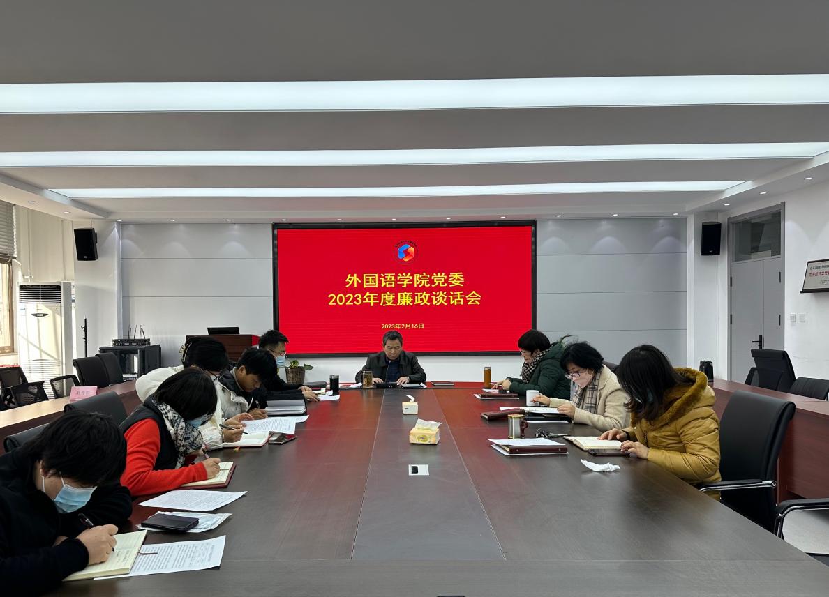 2月16日,外国语学院党委于文经楼C220会议室召开2023年度廉政谈话会议,会议由学院党委书记王效仿主持,学院全体党委委员、学院办公室成员、学生工作办公室成员参会。
