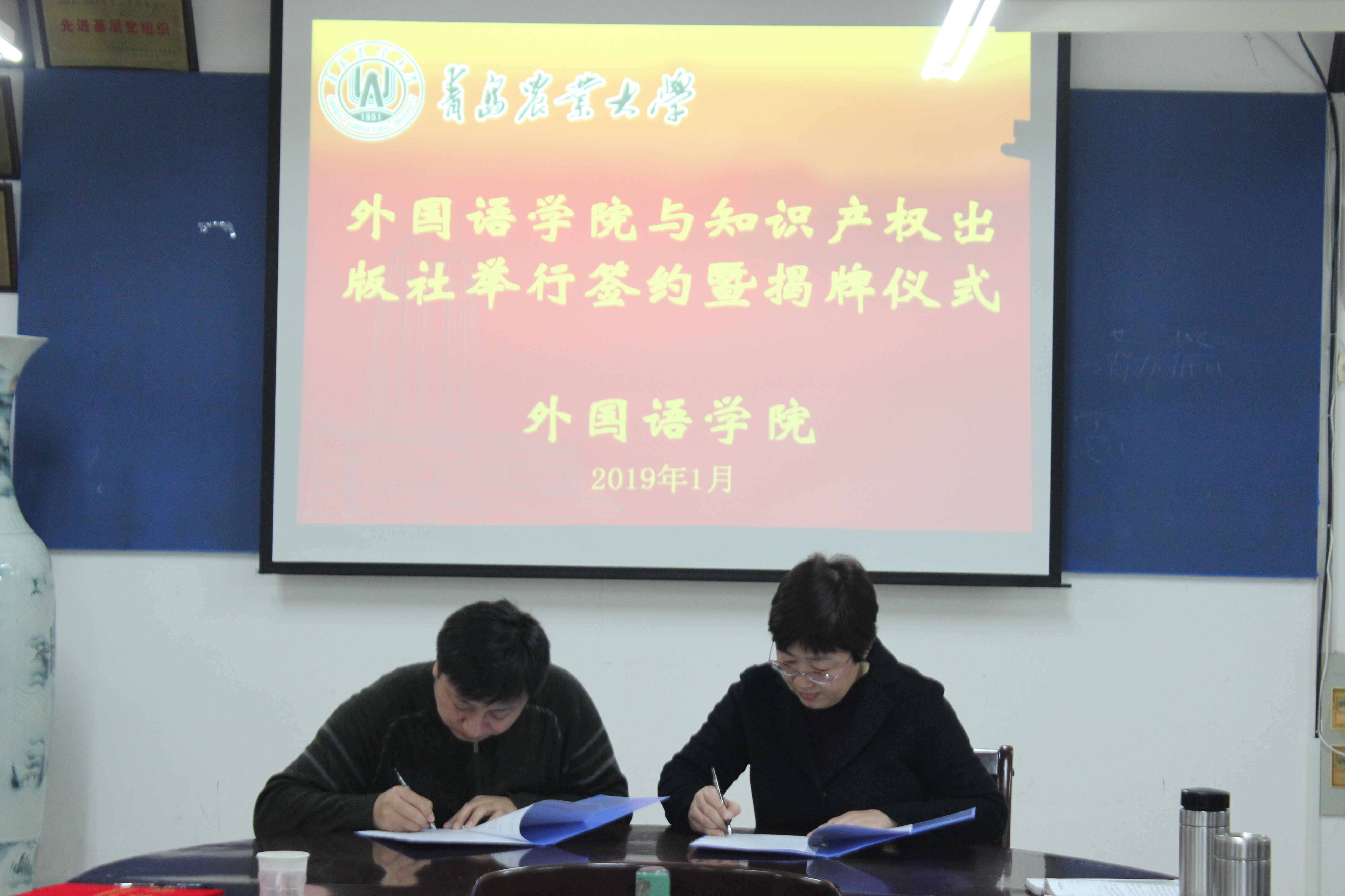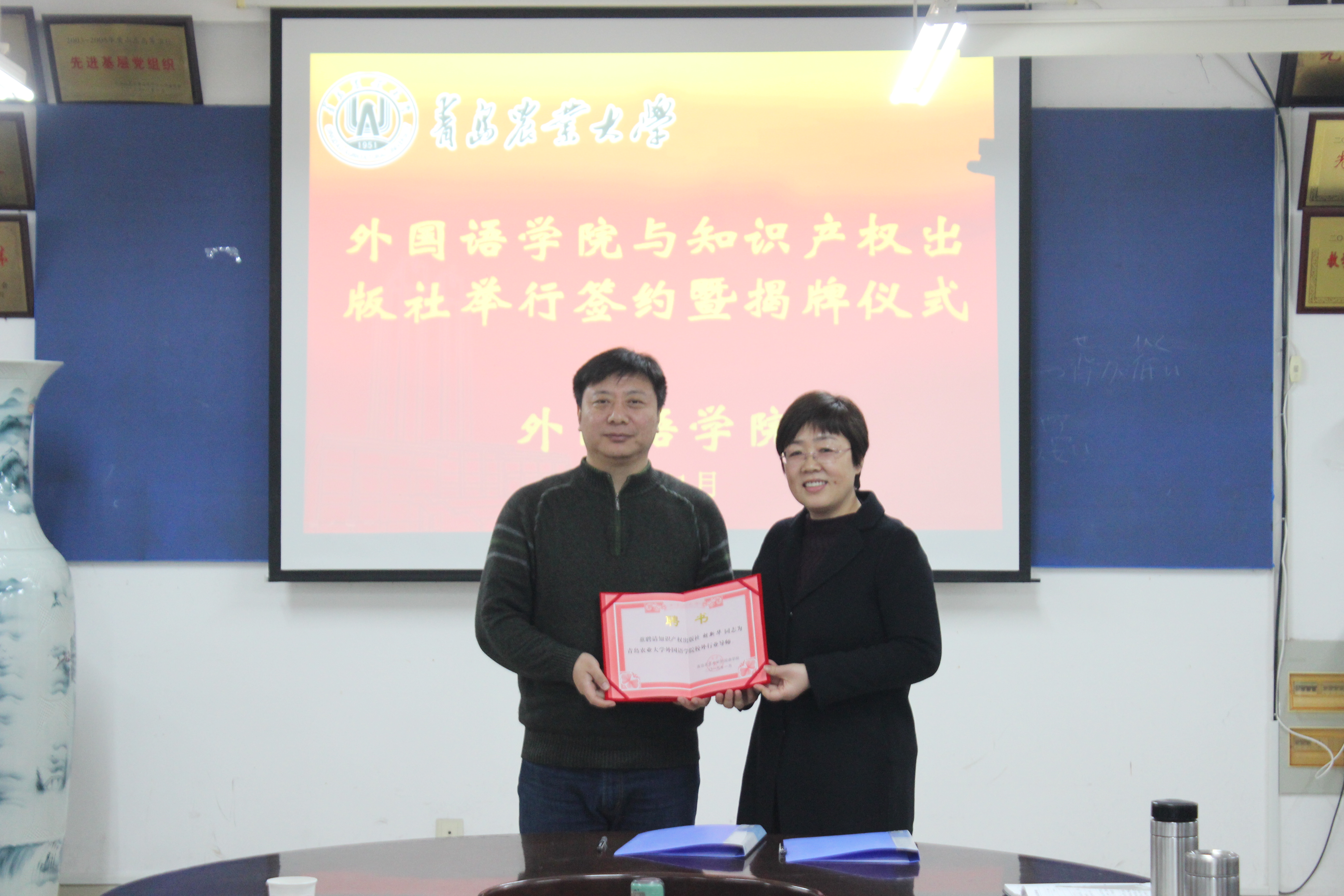 1月14日,外国语学院与知识产权出版社在文经楼举行校企合作签约仪式。学院副院长纪卫宁、李春梅、高秀雪,知识产权出版社胡新华主任等出席签约仪式。