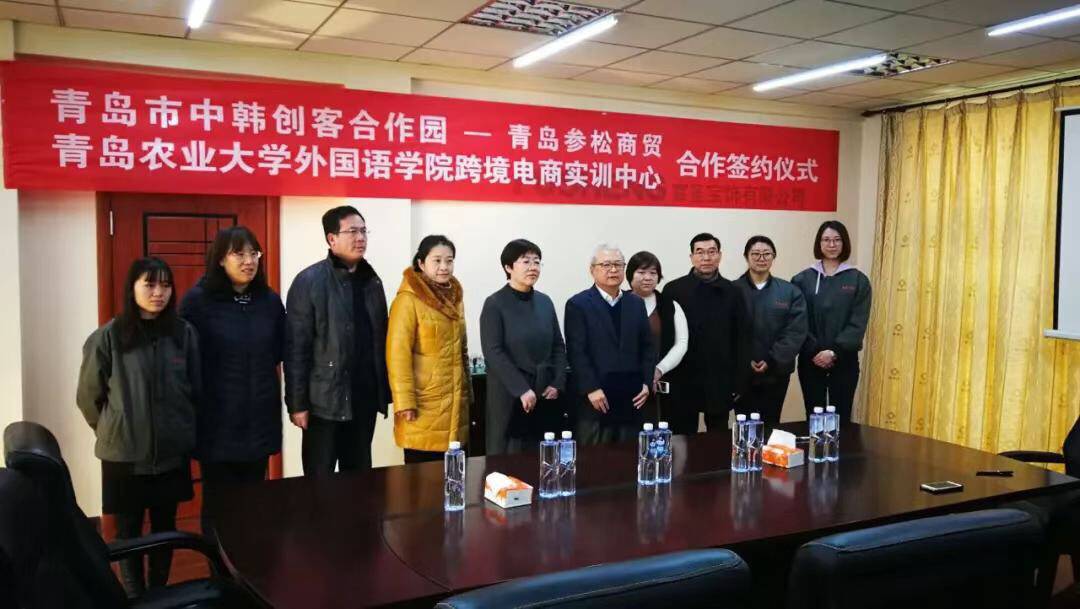 1月7日,青岛农业大学外国语学院与青岛中韩创客合作园(青岛参松商贸)举行跨境电商实训中心合作共建签约暨揭牌仪式。学院副院长纪卫宁和参松商贸董事长郑龙镇代表双方签约并为实训中心揭牌。学院副书记王晓雷、副院长李春梅、跨境电商专业教师左燕茹等出席仪式。