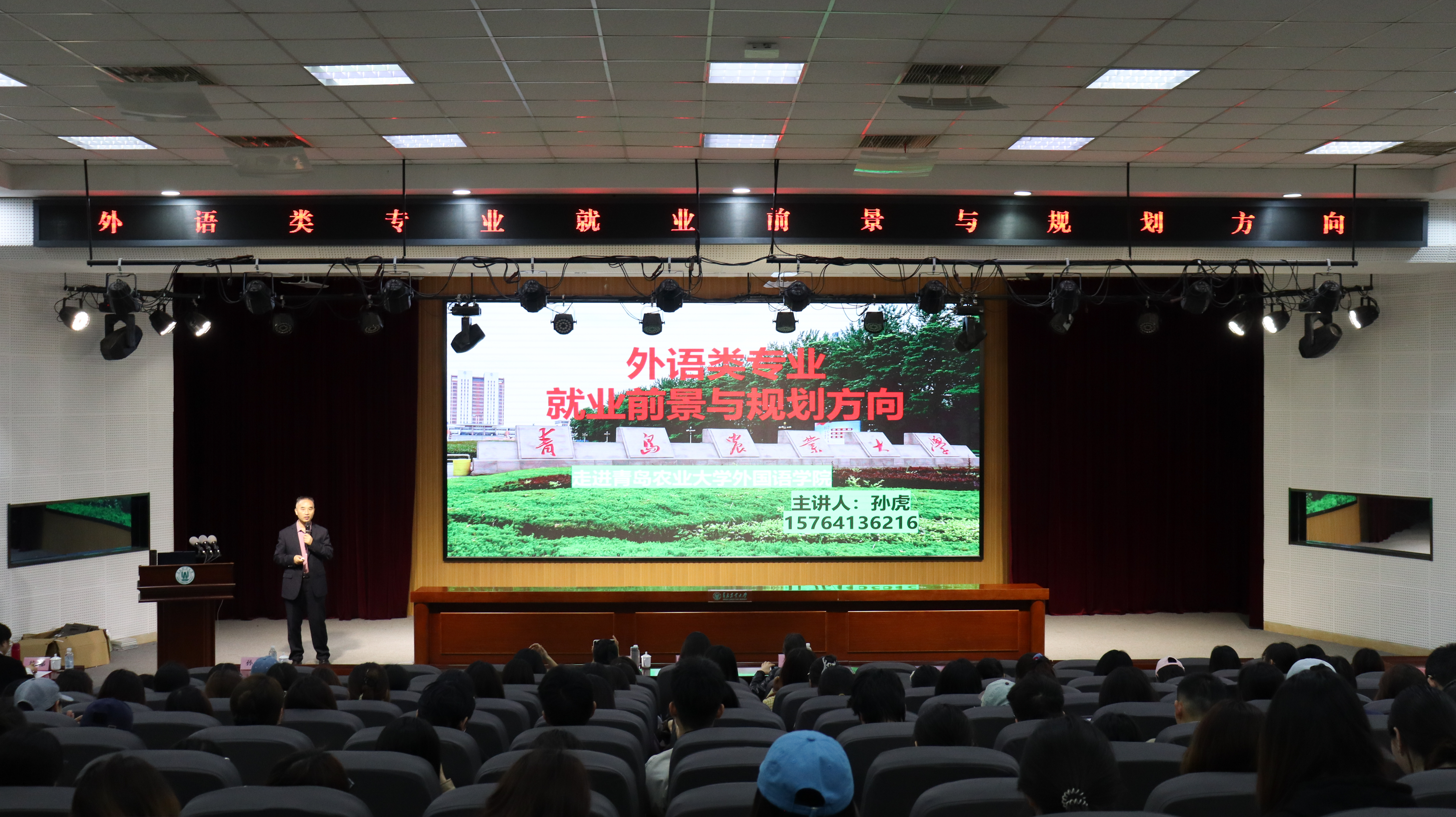 孙虎以《外语类专业就业前景与规划方向》为题,围绕外语类专业的发展趋势与挑战、当今社会对外语人才的需求、如何做好各项规划以及职业发展路径四个方面为外国语学院学子进行讲解。孙虎为外院学子提出了针对性的发展建议,特别强调多语种发展的重要性,鼓励同学们全面提升综合能力。在互动环节中,学生们积极踊跃提问,孙虎逐一进行了详细解答。