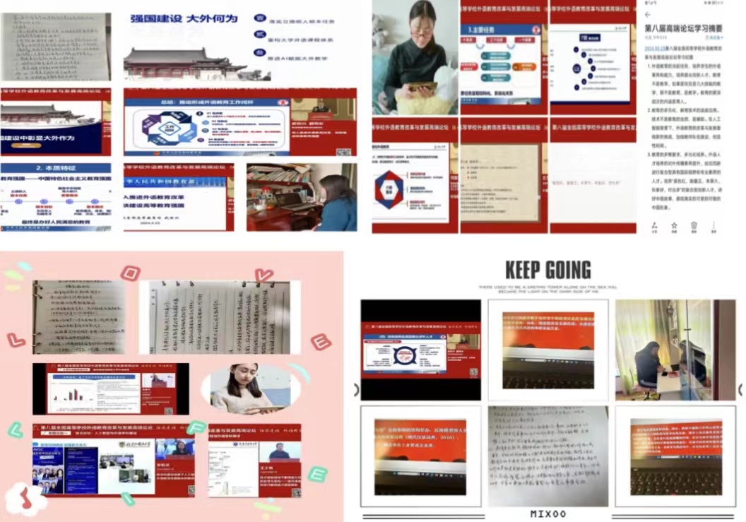 外国语学院大学英语第二教学部高度重视此次盛会,组织全体教师以线上观看直播的方式认真学习论坛内容并撰写学习心得。全体教师在线观摩专题论坛,交流互促,启迪新知。本次学习既提升了老师们对高等外语教育改革与发展方向的理解,又加深了老师们对外语教育改革发展中“危”与“机”的认识。在学习心得中,老师们纷纷表示在未来大学英语教学中将进一步推进大学外语教学改革,践行党的二十大精神、回应“强国建设 外语何为”的时代命题、助推培育新质生产力、聚力高等外语教育高质量发展。