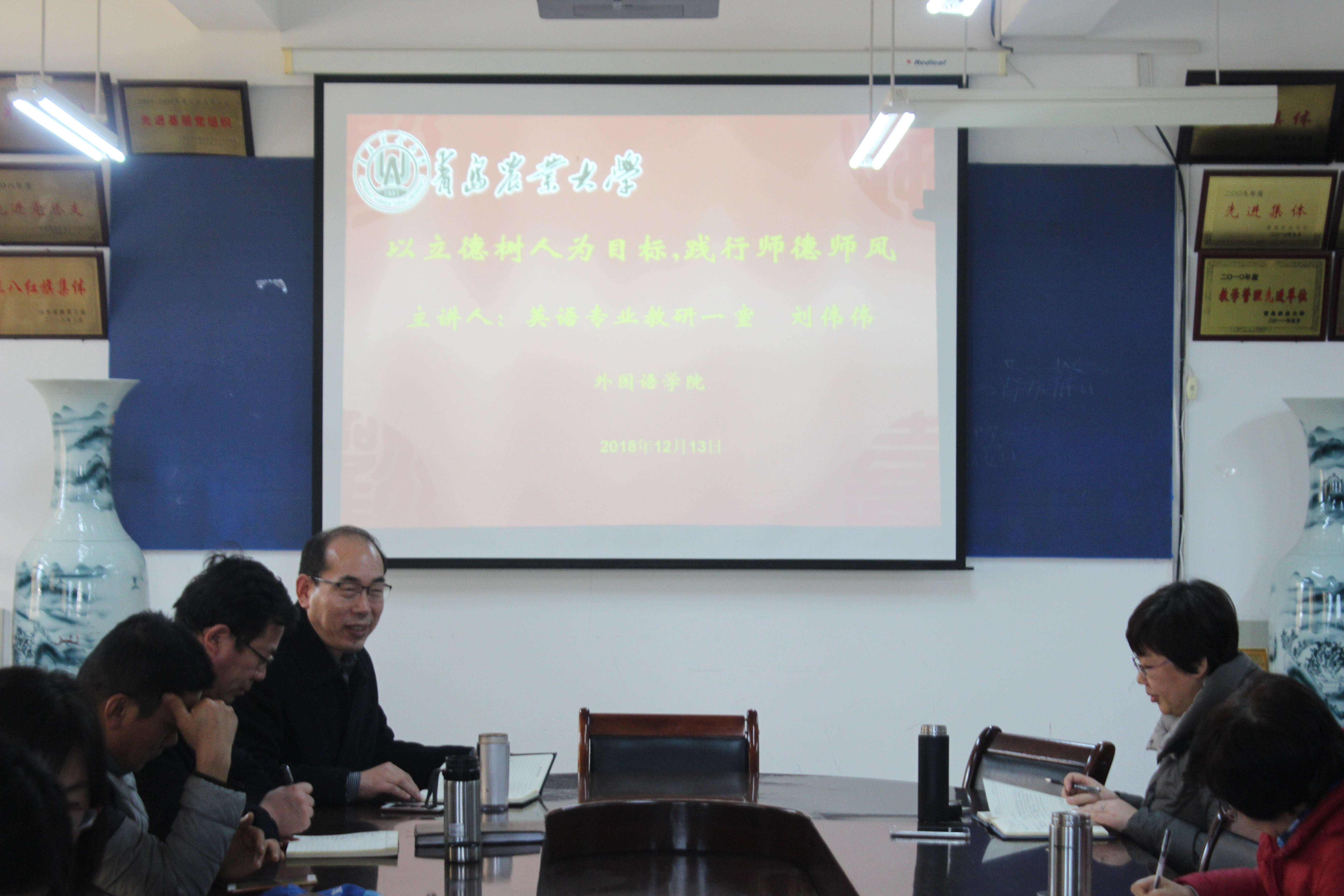 12月6日,青岛农业大学外国语学院于文经楼会议室召开师德师风主题教育交流会。学院党政领导出席,全体教职工参加。交流会由党委书记王仁高主持。