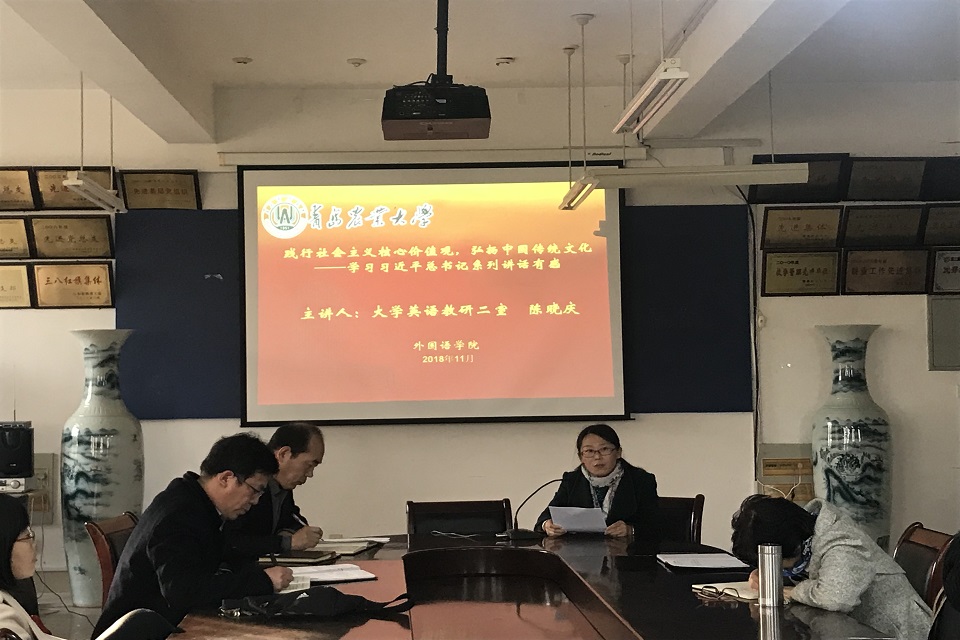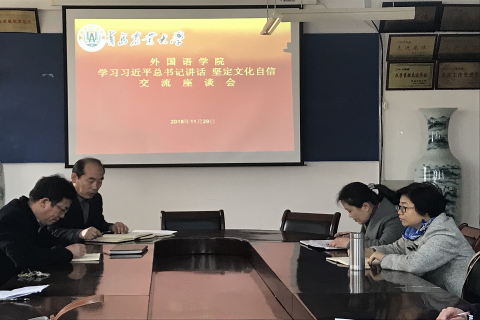 11月29日,青岛农业大学外国语学院于文经楼会议室举行“学习习近平总书记讲话,坚定文化自信”学习交流座谈会。学院领导和全体教职工参加。座谈会由党委书记王仁高主持。