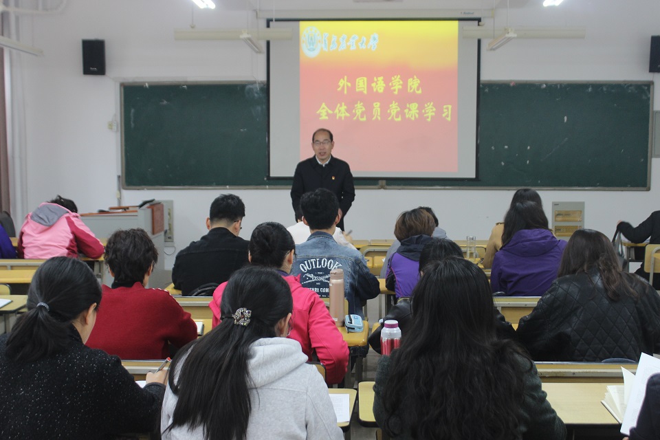 4月28日,青岛农业大学外国语学院在文经楼C214教室举行学习《中共中央关于加强党的政治建设的意见》(以下简称《意见》)专题党课,党课由学院党委书记王仁高主讲,全体师生党员参加学习。