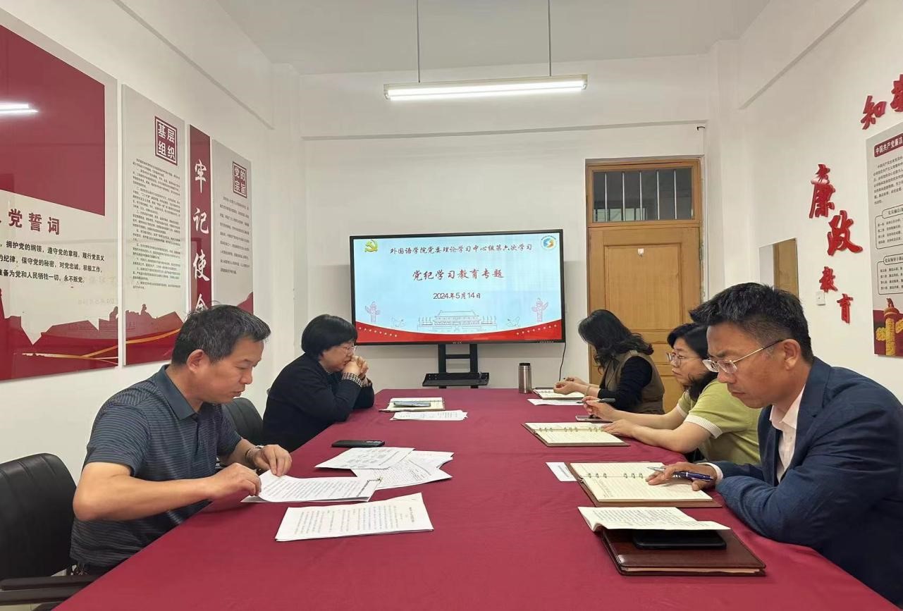 5月14日,外国语学院党委理论学习中心组在文经楼C206党员活动室举行党纪学习教育专题学习及交流活动。会议由外国语学院党委书记王效仿主持,学院党委理论学习中心组成员参加。