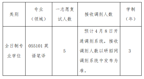 3.调入专业与第一志愿报考专业相同或相近(第一志愿专业代码为:045108学科教学(英语)、050201英语语言文学、050211外国语言学及应用语言学、055101英语笔译、055102英语口译)。