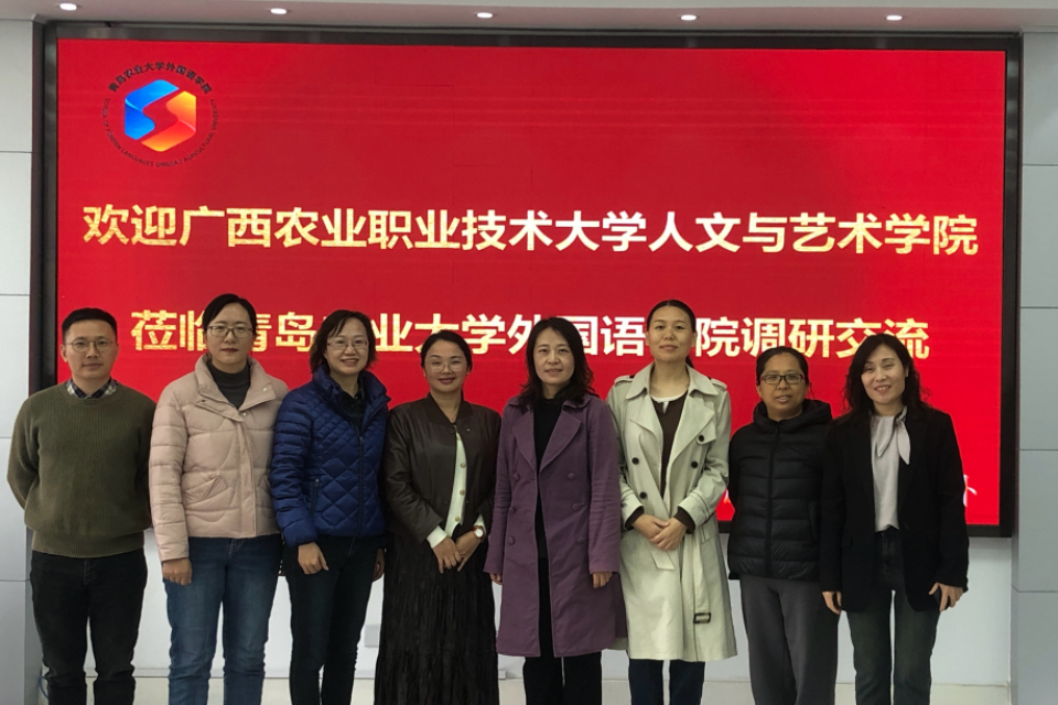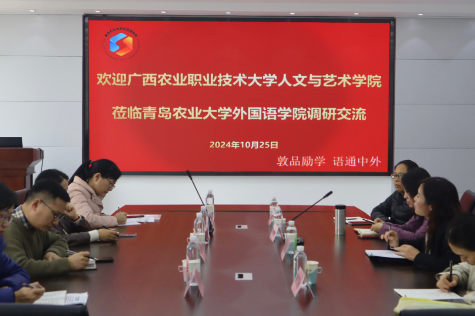 10月25日,广西农业职业技术大学人文与艺术学院副院长宁静一行四人到访我校外国语学院,就一流课程建设、课程思政建设、教材建设、师资队伍提升、品牌建设以及英语专业校企合作、产教融合等工作进行调研交流。外国语学院李春梅副院长、大学英语教学部主任聂庆娟、王珍以及英语系副主任姚雪丽参加。