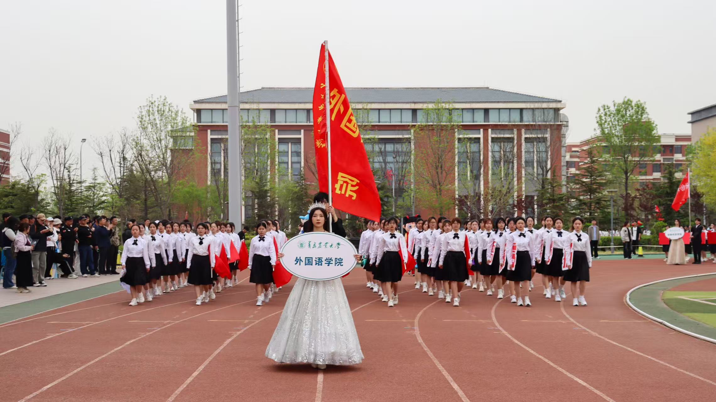 外国语学院“虹子初心”代表方队在开幕式中大放异彩,彩带飘扬,红旗跃动,青春与梦想交织。象征着“虹文化”的七色彩带穿梭飞扬,好似青春的调色盘,绘出绚烂多彩的画卷,寓意着外国语学院学生们丰富多彩的校园生活与无限可能的未来。舞动的红旗,映着青春的面庞,展现出当代大学生的拳拳爱国心,彰显着他们对祖国的深深热爱与崇高敬意。列队学生代表身穿黑白相间学院风制服,精神抖擞、步伐整齐、口号嘹亮,斗志昂扬,充分展示了新时代外语人的自信与激情。
