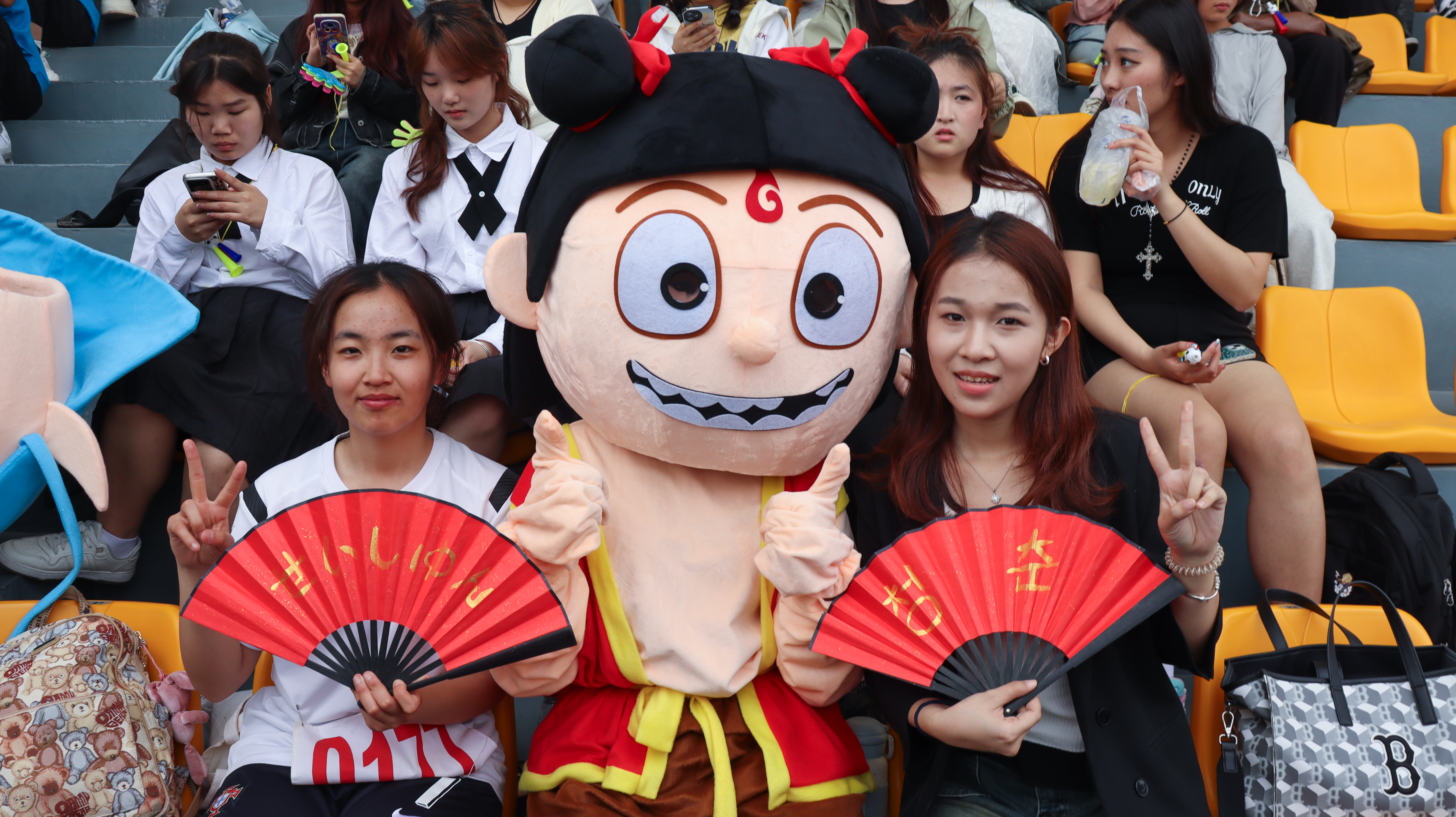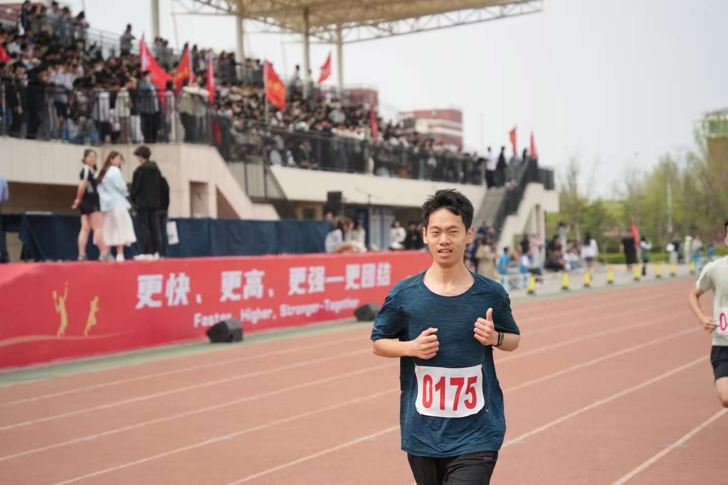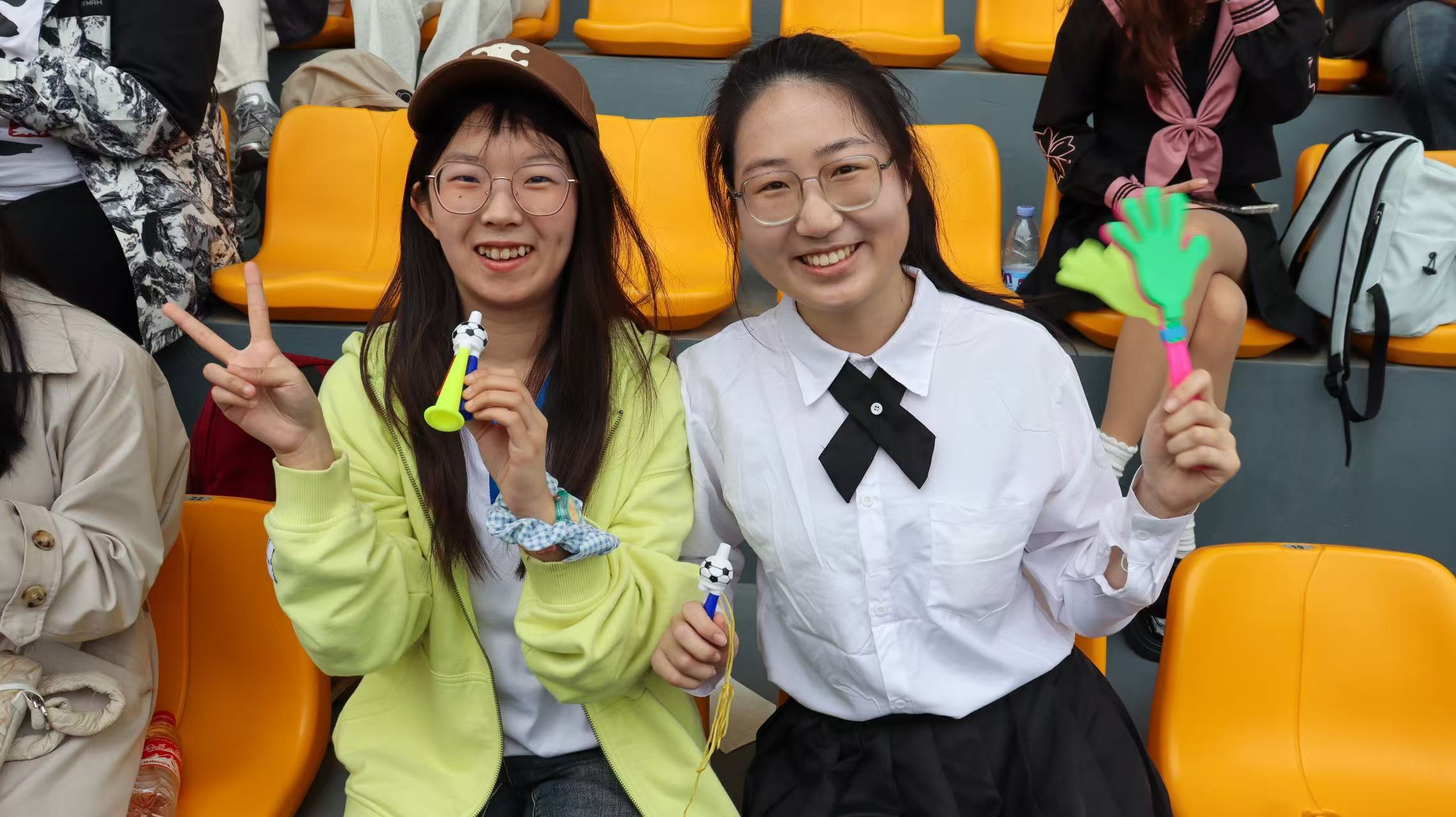 赛场外,外国语学院师生全力应援,是运动员坚实的后盾。啦啦队员身着多巴胺色系队服,色彩明快活泼,洋溢着青春活力。她们动作整齐划一,节奏精准,每一个动作都充满力量与激情,为运动员注入拼搏动力。志愿者们在补给站、检录处不停忙碌,为运动员递水、引导检录,默默保障赛事顺利进行。观众席上,大家热情高涨,奋力为运动员加油助威。