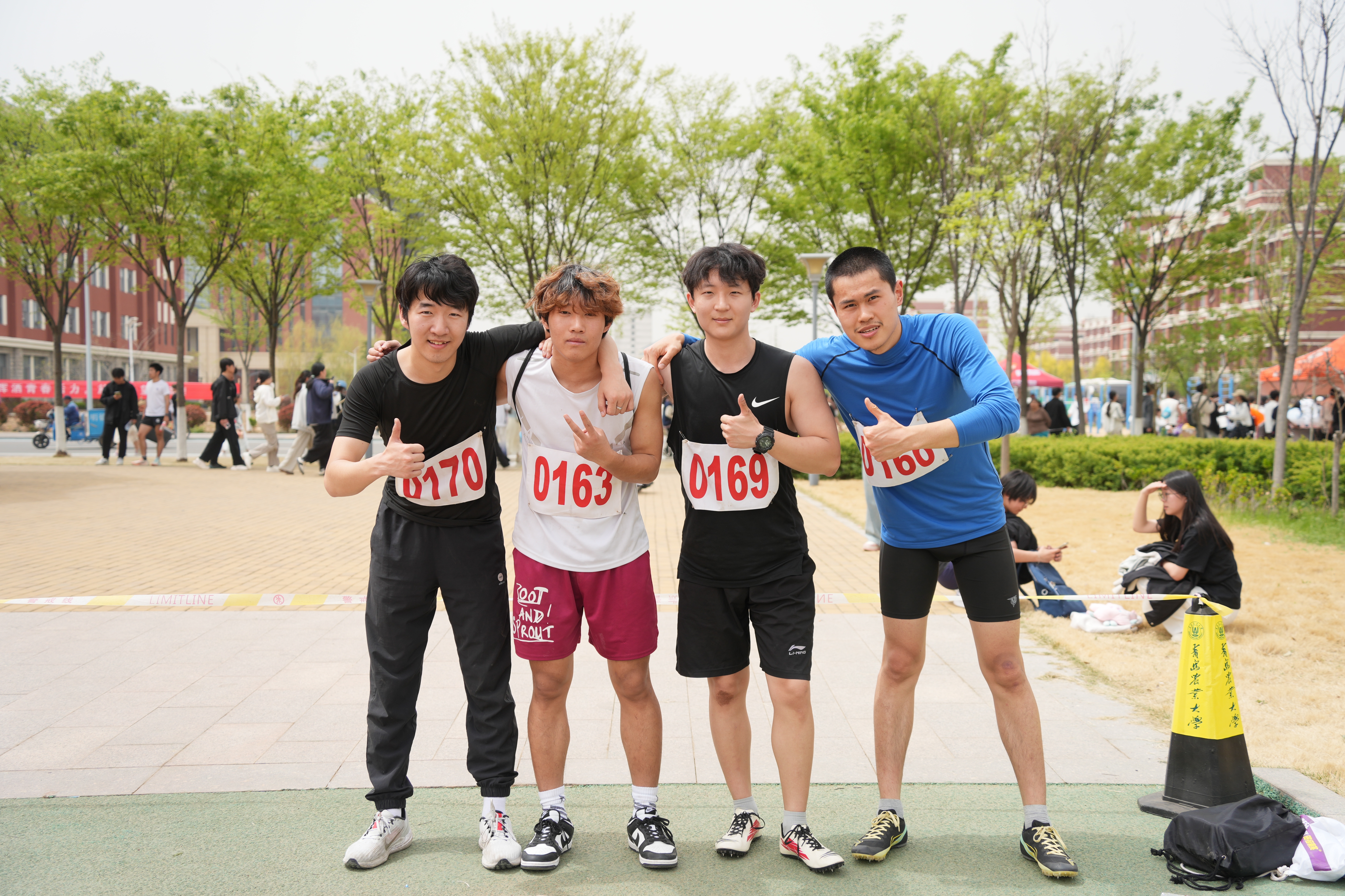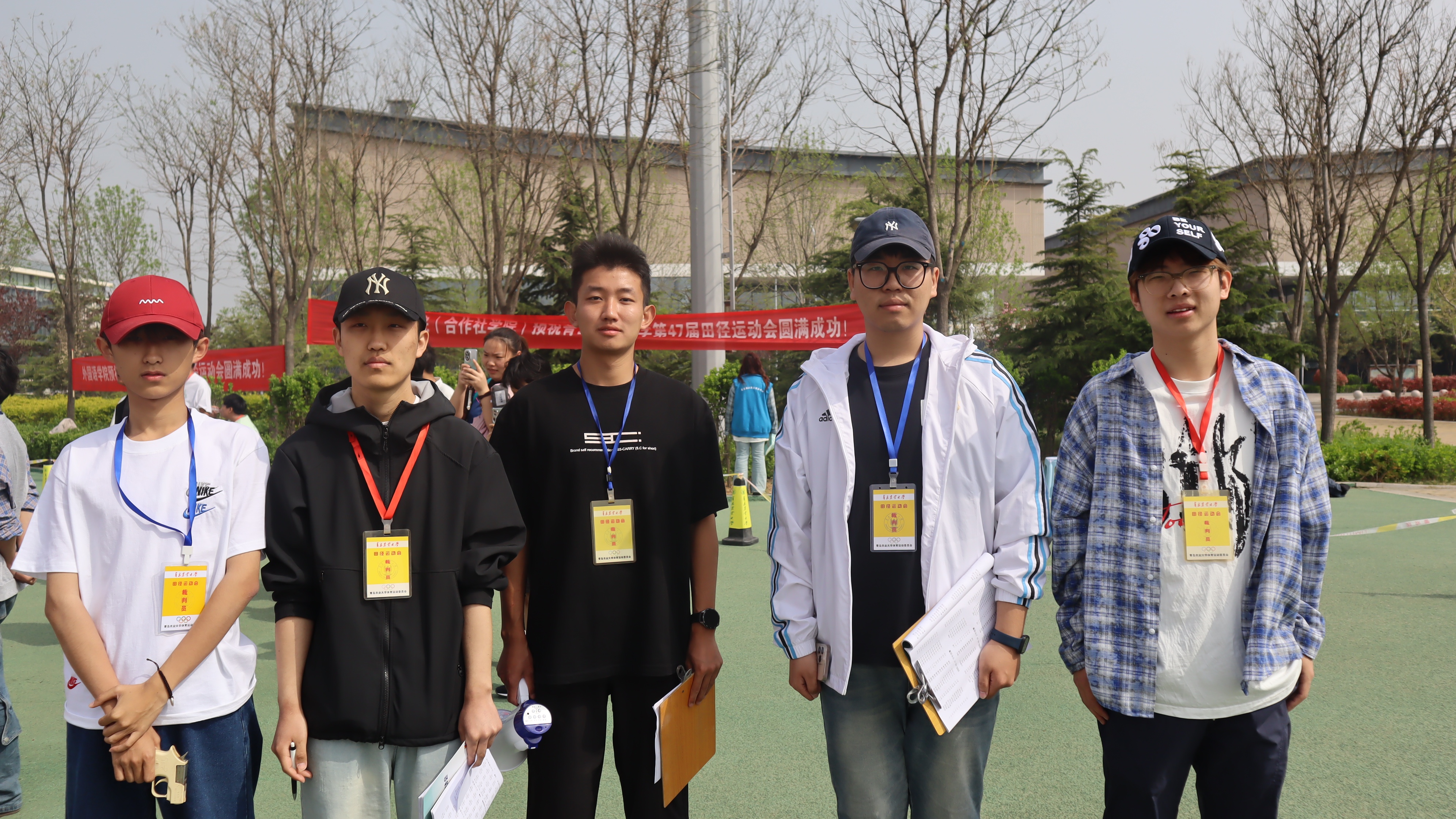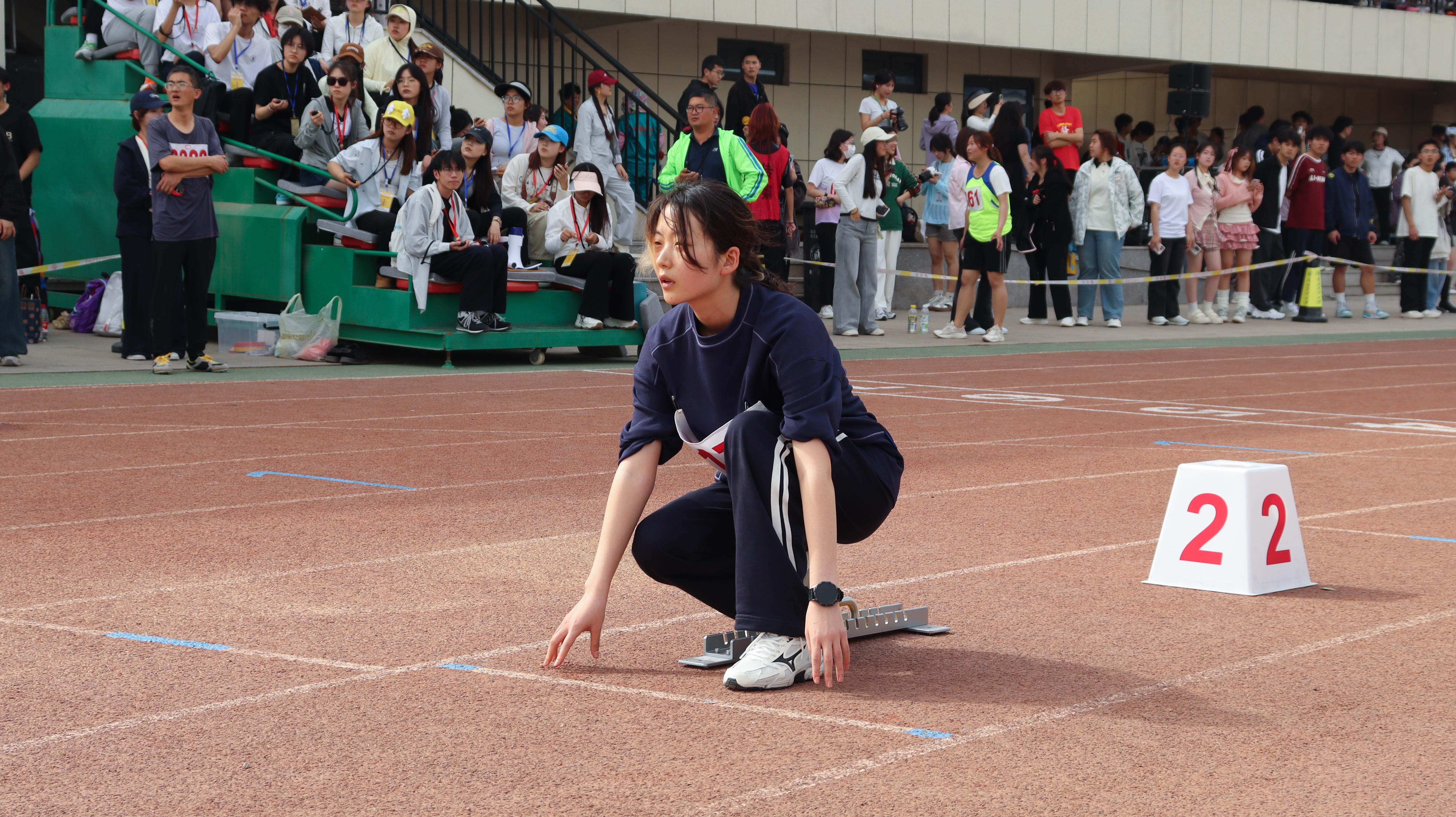 赛场外,外国语学院师生全力应援,是运动员坚实的后盾。啦啦队员身着多巴胺色系队服,色彩明快活泼,洋溢着青春活力。她们动作整齐划一,节奏精准,每一个动作都充满力量与激情,为运动员注入拼搏动力。志愿者们在补给站、检录处不停忙碌,为运动员递水、引导检录,默默保障赛事顺利进行。观众席上,大家热情高涨,奋力为运动员加油助威。