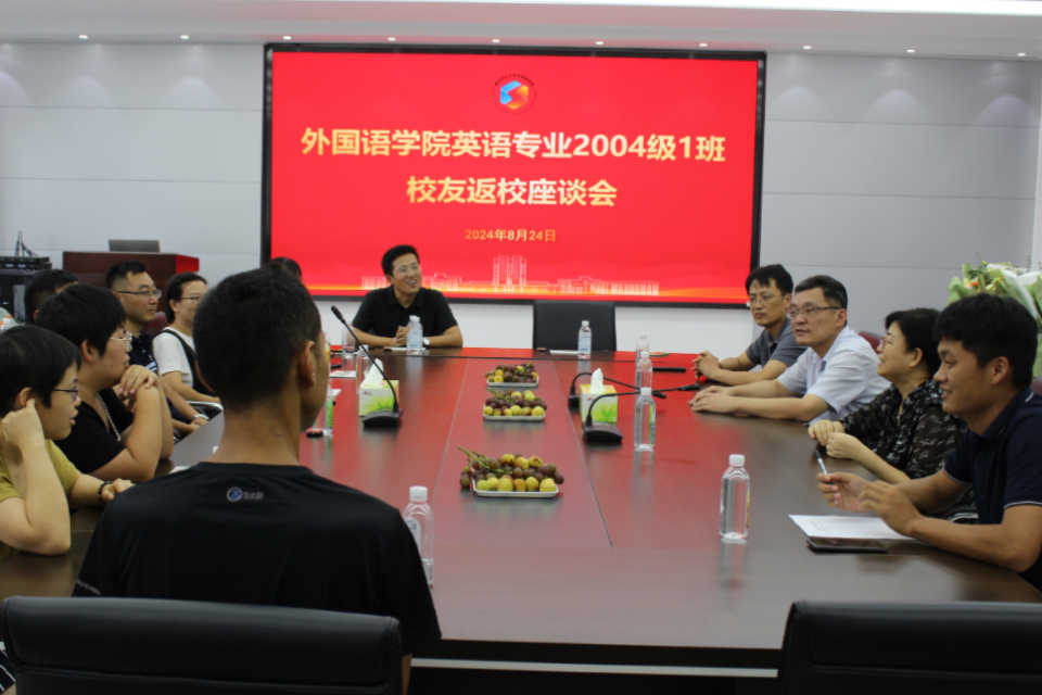 时光荏苒,情谊永恒。8月24日,外国语学院英语专业2004级1班在文经楼C220举办校友返校座谈会,原外国语学院党委书记焦磊,外国语学院副院长高秀雪,教师张海庆,辅导员王洋洋,英语专业2004级1班校友参会。会议由原外国语学院党委书记、英语专业2004级1班校友班主任焦磊主持。