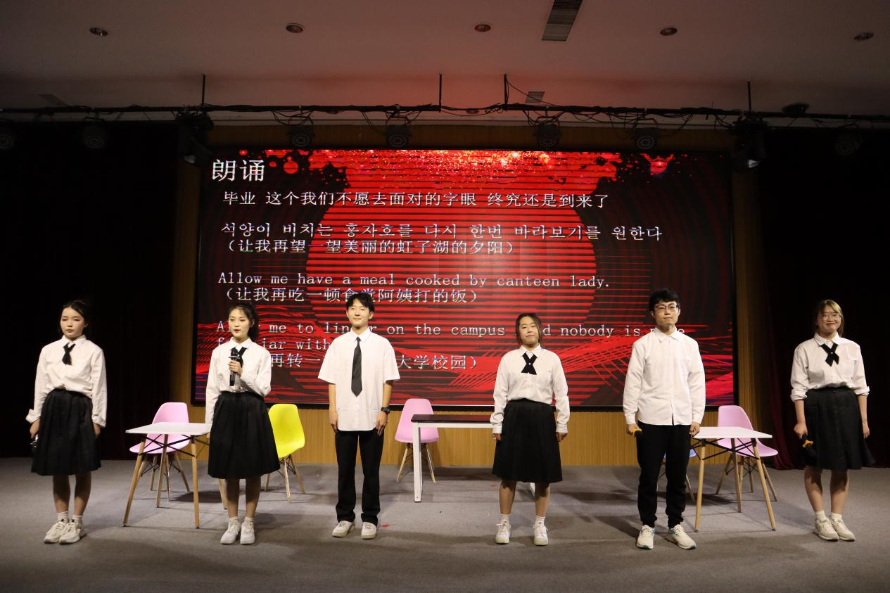 “接续奋斗·不负时代”篇章由朗诵《毕业》开篇,徐玉凤老师、高艳艳老师以及毕业生李春月等用四国语言朗诵,声情并茂、感情饱满地表达了师生间深厚的情谊,以及学院师生对毕业生的美好祝福。