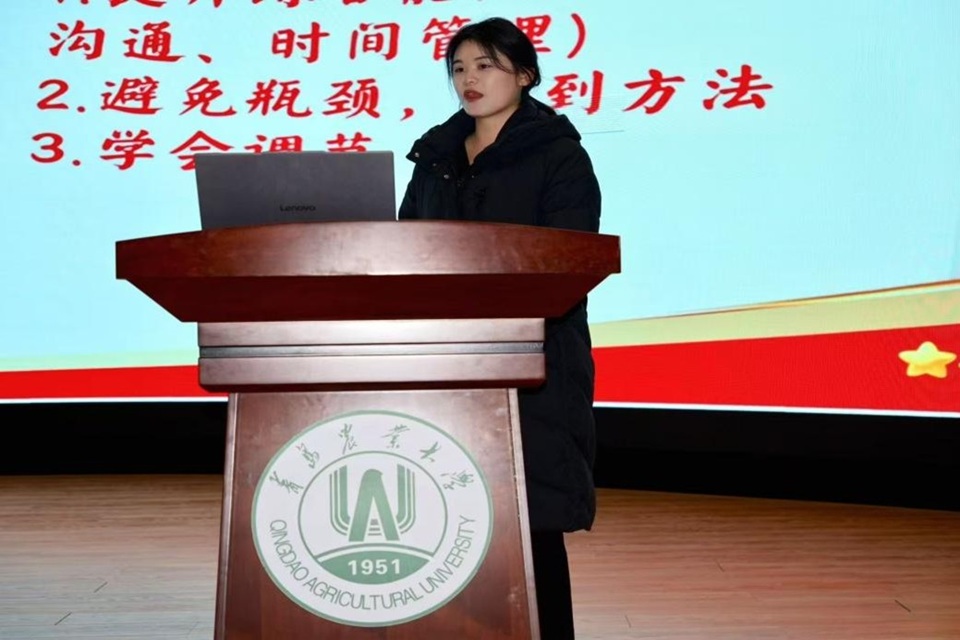 12月14日,外国语学院在平度校区明德楼报告厅成功举办榜样引领团第三期“学思践悟,赋能成长”经验分享会。本次会议由未来生涯规划中心主任侯方钰主持,外国语学院2025级班级两委会成员及学院学生会成员参加。
