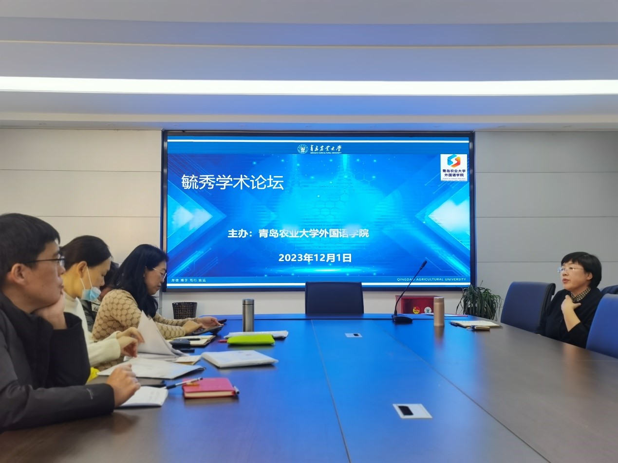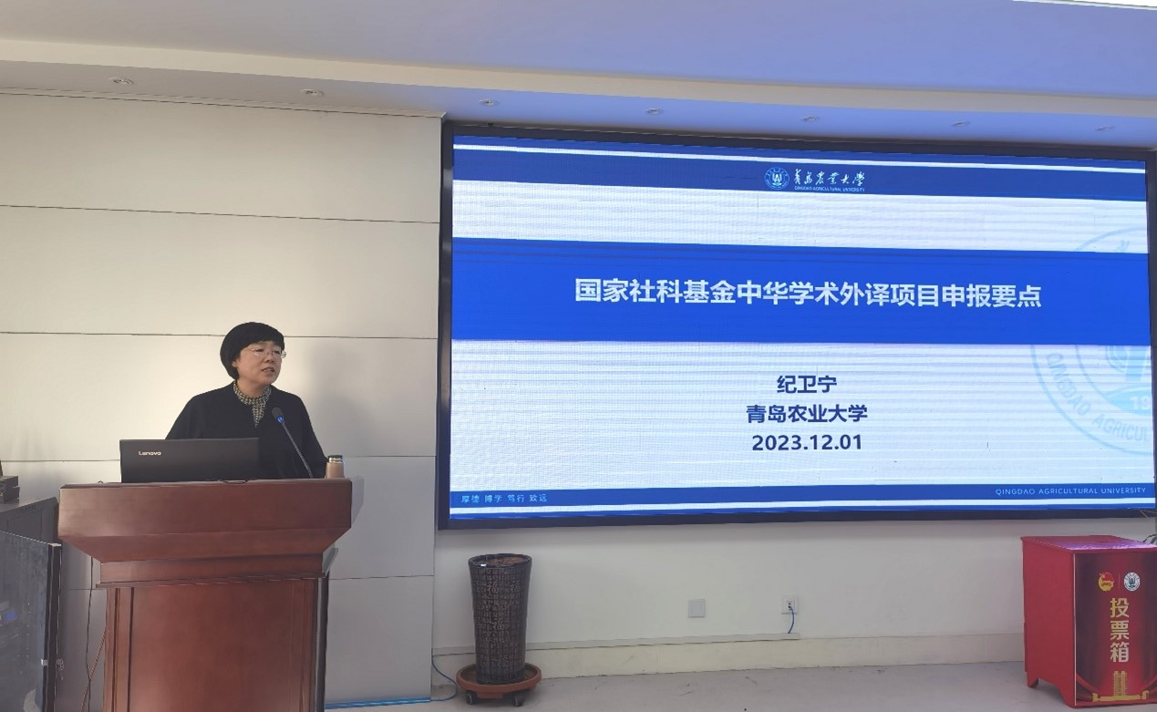 青岛农业大学外国语学院院长纪卫宁于12月1日在文经楼C220举办《国家社科基金中华学术外译项目申报指导》讲座,学院翻译硕士研究生导师、硕士生任课教师、学士论文指导教师参加,英语系主任徐玉凤主持讲座。