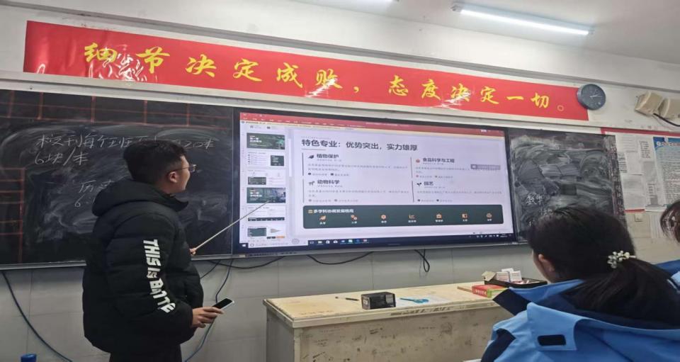 在胶州三中,赴青岛实践团通过PPT展示、资料发放等形式,向高三学子介绍青农办学特色、优势学科及特色专业,同时拜访恩师、讲述自己的成长经历;在巨野一中,赴滨州实践服务团面向70余名高三学生系统讲解青农历史、学科优势与招生政策,分享备考技巧,并通过访谈问卷收集反馈。