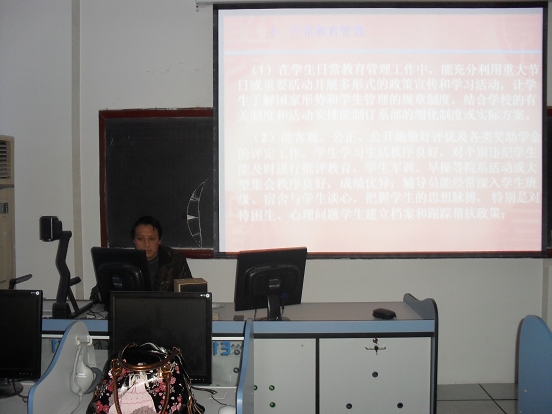 李岩详细汇报了外语系2009年学生工作的整体情况和取得的成绩,在学院党政的领导,各职能部门的支持配合下,外语系学生主题教育月活动常抓不懈,常规管理工作成绩突出,特色工作不断推陈出新,学风建设初见成效,一年来在学校的各项活动中取得了优异的成绩。检查组观看了PPT汇报,并查看了学生工作资料档案。