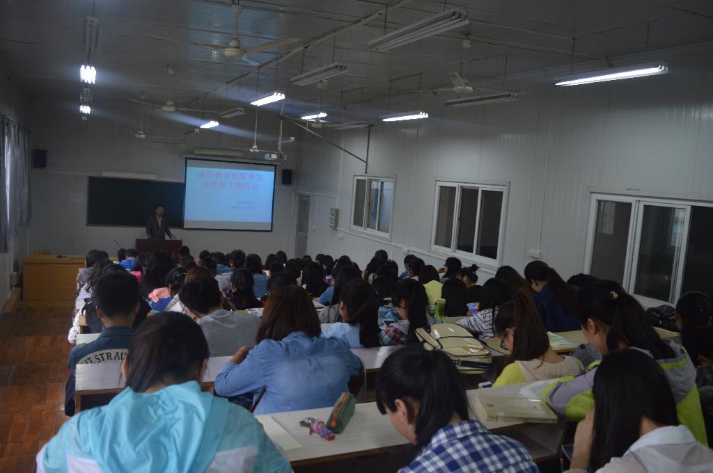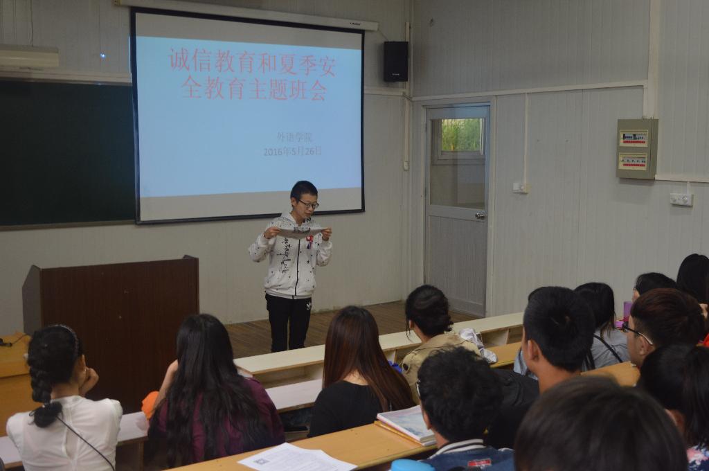 5月26日下午外语学院2015级130多同学在辅导员杨厚东老师的主持下在6405教室召开了诚信教育及夏季安全教育主题班会。