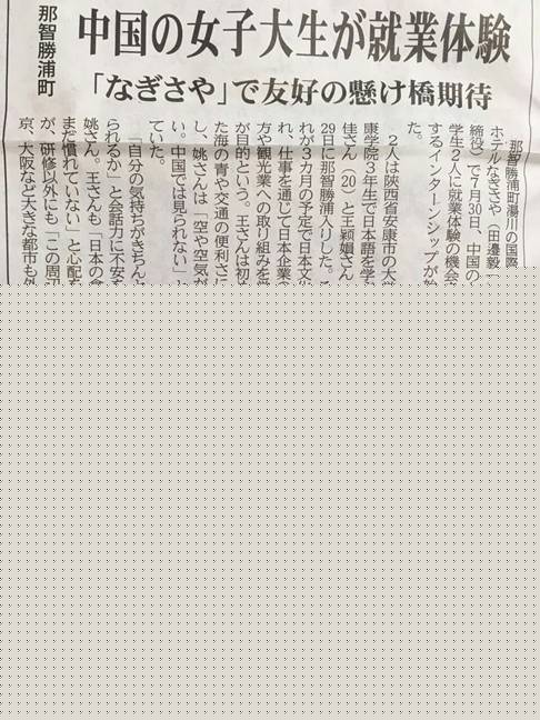 8月3日,日本熊野县官方媒体“熊野新闻”以《中国女大学生就业体验--希望在“なぎさや”架起友好的桥梁》为题,报道了我校姚佳佳和王颖娟同学在该县实习研修情况。“なぎさや”酒店社长、JTB和中日科技文化中心相关工作人员、姚佳佳和王颖娟同学接受了熊野新闻采访。在采访时,两名同学表示一定会珍惜此次实习机会,更多地了解日本文化习俗,提升日语口语表达能力,同时希望能够到东京、大阪等大都市去做进一步体验与锻炼。JTB的白川尚宏先生希望通过两位同学将日本旅游业的亮点带到自己国家进行宣传。中日科学技术文化中心的佐藤清美女士在采访中则表示包括姚、王两位同学在内的赴日研修生能够在日本工作,为两国青年交好打下了基础,希望进一步深化两国之间的联系。田边社长表示,本次实习将进一步促进双方友好交流,不断推进中日科技文化交流事业。