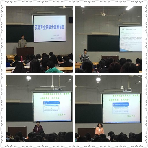10月27日下午,我院于6号教学楼408室召开了英语专业四级考试动员大会,学院副院长张哲华,系主任王欢出席了此次大会。此次大会由英语专业综合英语课程负责人姜国波主持,专业课教师李莉、蔡婷婷应邀参加,2015级全体英语专业学生参与了本次动员大会。