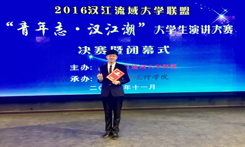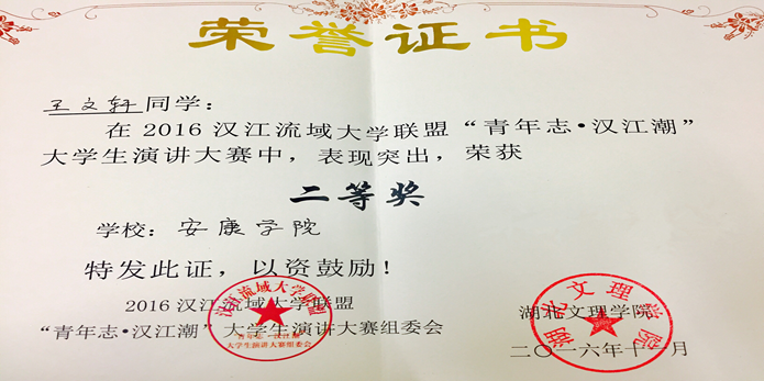 最终,我校外语学院王文轩荣获汉江流域大学联盟“青年志•汉江潮”大学生演讲大赛二等奖。