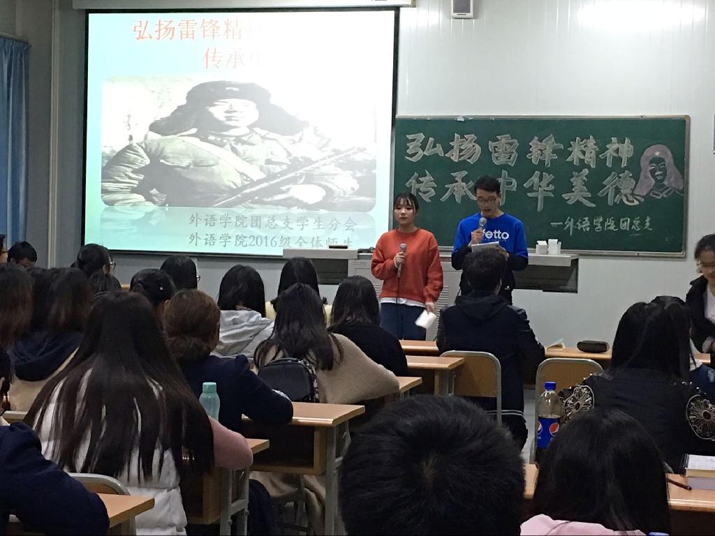 3月24日晚上,由安康学院外语学院团总支学生分会组织承办的“弘扬雷锋精神, 传承中华美德”的团日主题班会在10号教学楼拉开帷幕。出席此次活动的有团总支书记常远红、团总支副书记吴眯、学生会分会副主席刘伟,以及外语学院2016级全体学生。