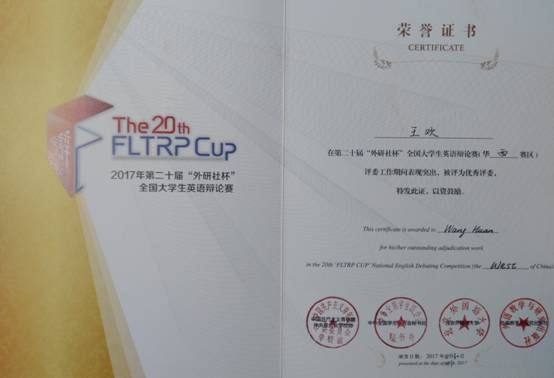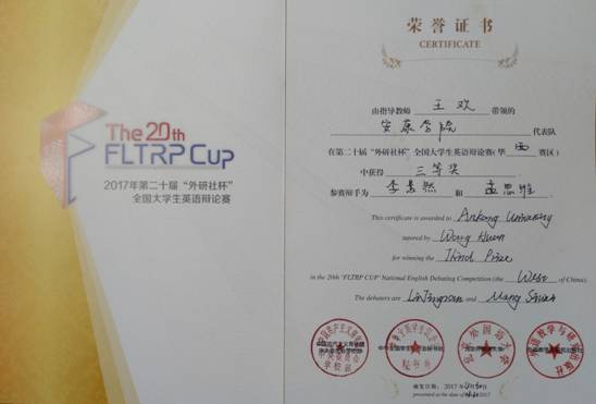 4月28至30日,第二十届“外研社杯”全国大学生英语辩论赛华西赛区决赛在四川外国语大学举行。经过六轮紧张的积分循环赛,我校外语学院李景然和孟思维同学组成的代表队,凭借扎实流利的语言表达与灵活缜密的辩论技巧,最终荣获华西赛区决赛三等奖;带队、指导教师王欢因在评委工作期间表现突出,被评为本次比赛“优秀评委”。这是我校继2012年后再次参加全国大学生英语辩论赛取得的又一佳绩。