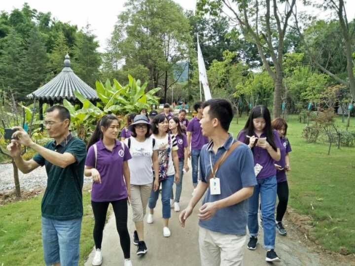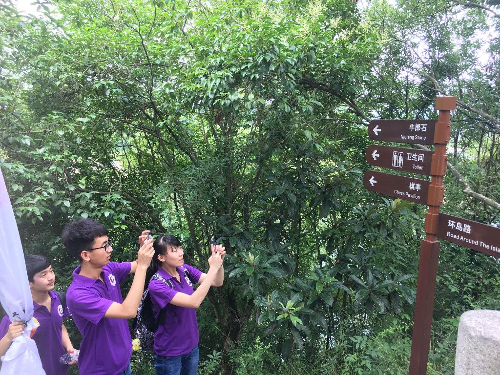上午8点整,实践团在辅导员老师常远红、杨厚东及专业指导老师邓雪玲的带领下准时从学校出发前往瀛湖实践点。到达瀛湖实践点后,实践团队与支持本次活动的瀛湖景区负责人胡甲文会面,由他协助实践团完成本次的调研活动。沿着景区的主干线,实践成员们边收集公示语标牌及其英译的第一手语料,边主动与老师讨论分析其英译的规范性。队员们还对景区游客及景区工作人员进行了公示语英译语言规范性的问卷调查,游客们对本次的社会实践活动非常支持,积极配合问卷调查并提出对景区标识语的意见和建议。景区负责人胡甲文积极为实践队员们讲解各个景点的历史文化背景,实践队员们不懂就问,积极做笔记,为后续的翻译工作提供依据。完成整个景区的实地调研工作后,实践团对瀛湖景区总经理秘书王女士、规划部长康先生及景区管理人员梁总进行了采访。他们表示瀛湖景区对此次外语学院的实践活动非常支持,瀛湖景区目前正处于申报国家AAAAA级景区、标准化建设阶段,此次外语学院的实践活动为他们实现近期目标提供了充足的支撑材料。他们还表示,瀛湖景区正逐步走向国际化标准,需要大量的外语翻译人员,愿意提供岗位给外语学院学生,希望能和外语学院在标准化建设阶段紧密合作,实现共赢。