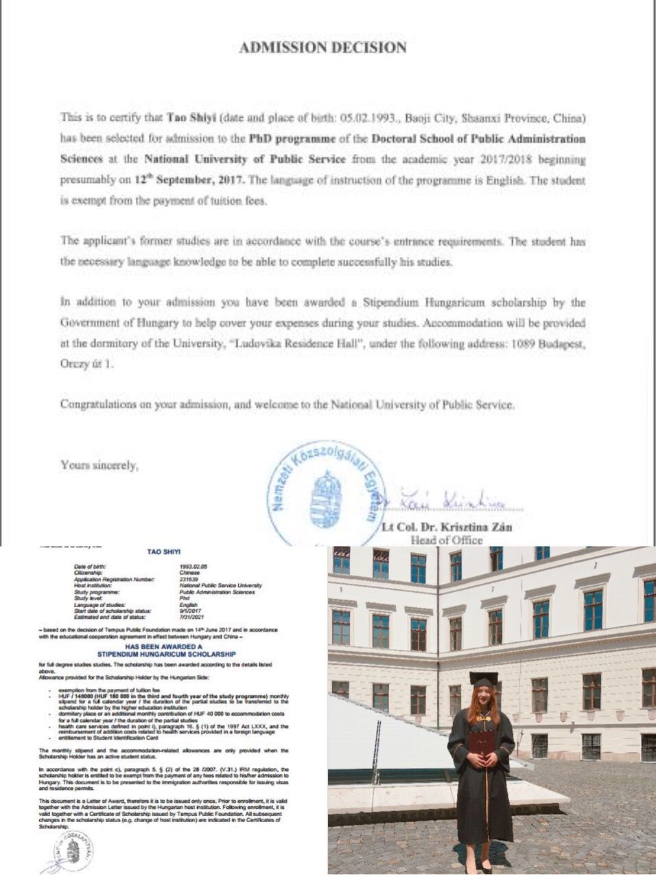 2015年9月,经外语学院和国际处推荐,安康学院遴选上报,陶适意同学获得国家留学基金委全额资助前往匈牙利国家行政大学攻读硕士研究生学习机会。经过刻苦学习,2017年7月以优异成绩毕业。经中国驻匈牙利大使馆教育组推荐,陶适意同学再次通过国家留学基金管理委员会和匈牙利政府及相关高校的严格评审,被匈牙利国家行政大学(National University of Public Service)录取为博士研究生,并将在留学期间享受匈牙利政府奖学金,包括免学费,免住宿费或提供住宿费补贴,提供部分奖学金生活费等资助内容。