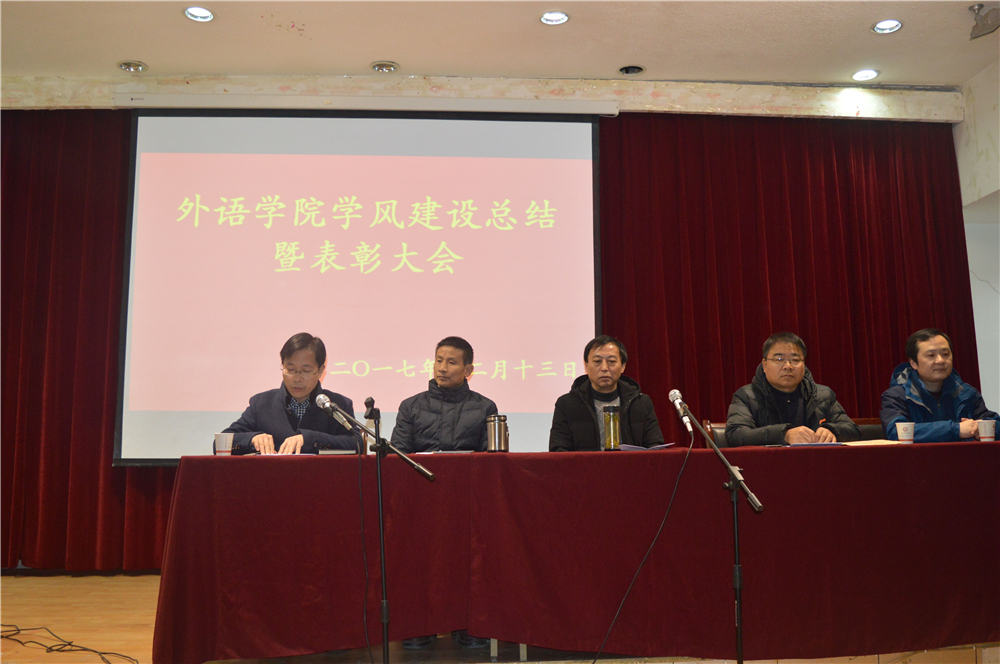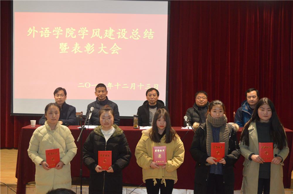 12月13日下午2:30,外语学院2017年度学风建设总结曁表彰大会在一号教学楼六楼报告厅召开,学院领导班子、教务处教学实践科科长徐江涛、我院全体教师以及15、16、17级学生参加表彰大会。大会由党总支书记郭家平主持。