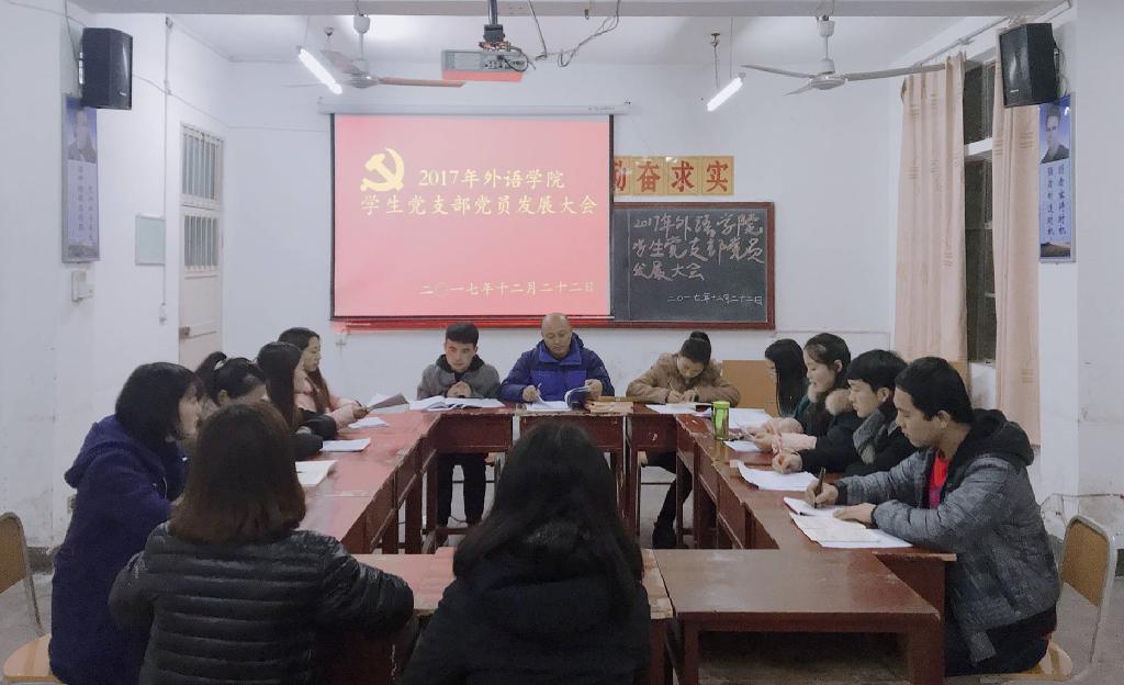 2017年12月22日,外语学院学生党支部在6303教室召开了党员发展大会。学生党支部书记郝礼军、全体学生党员、预备党员及本次拟发展8名发展对象参加。会议由学生支部委员王乔主持。