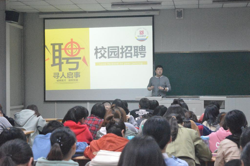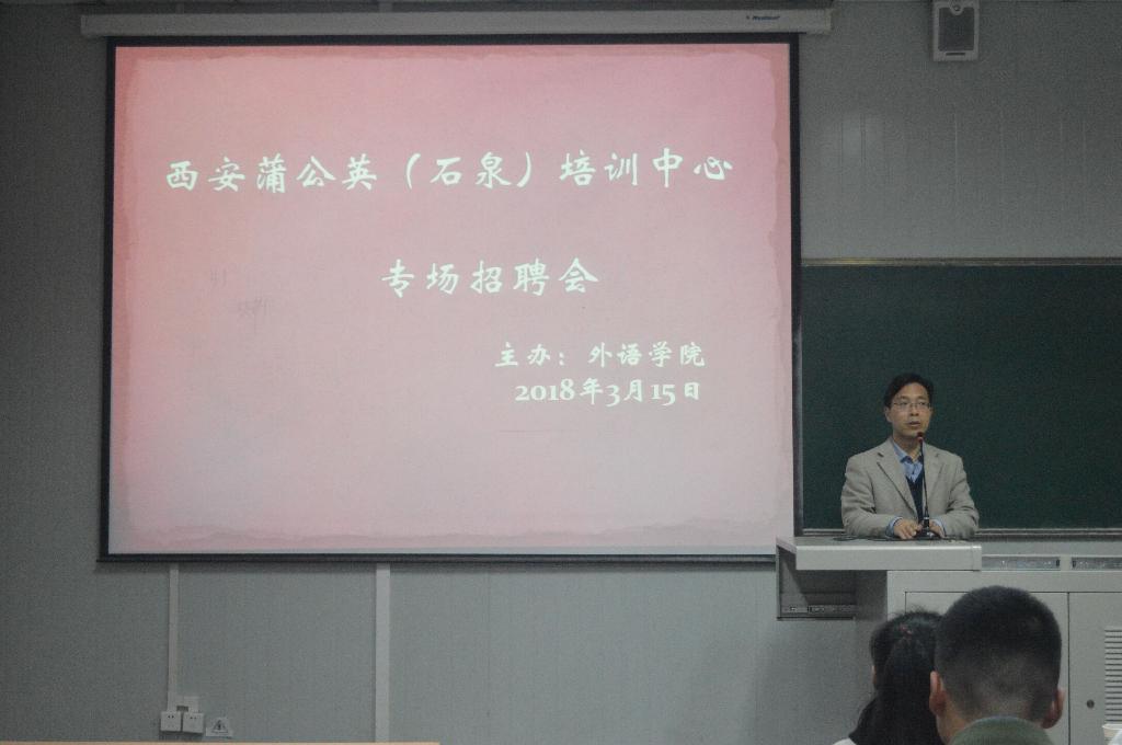 此次招聘会的主讲人为西安蒲公英(石泉)培训中心校长刘建强,会上,他通过PPT重点介绍了培训中心的基本概况和发展前景,为同学们分析了英语师范专业的就业情况、分享了大学生就业经验,最后介绍了同学们关心的应聘条件以及薪酬福利,同时也对同学们面临的就业问题给予了指导与建议。