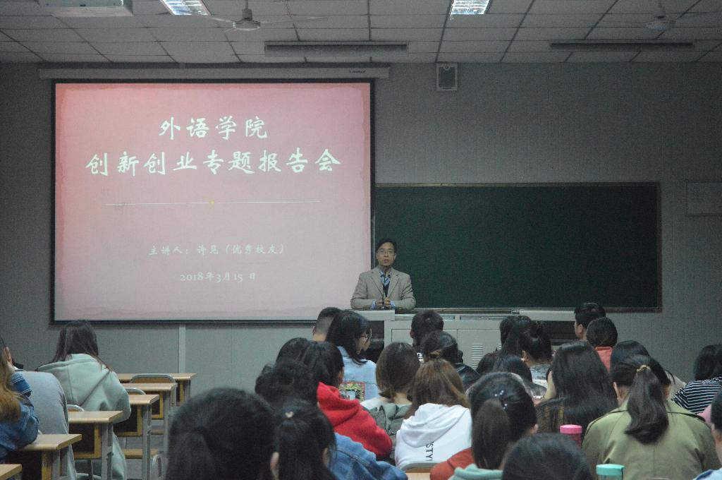 3月15日下午,外语学院于江南校区1014教室举办“创新创业专题报告会”。本次报告会特邀安康学院外语学院优秀校友、西安蒲公英学校石泉分校创始人、安康市大学生创业协会副会长许见做专题报告。外语学院副院长张哲华、辅导员常远红及2014级、2015级全体学生参加了报告会。会议由张哲华主持。