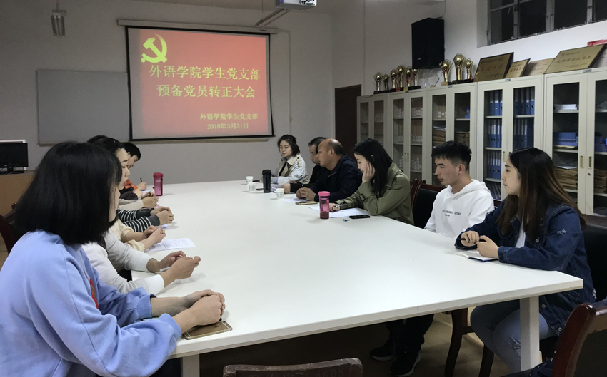 3月31日下午,外语学院预备党员转正大会在6109会议室召开,外语学院党总支纪检委员、入党介绍人冀文辉、入党介绍人冯琳、外语学院学生党支部党员、拟转正预备党员参会,会议由党支部书记郝礼军主持。
