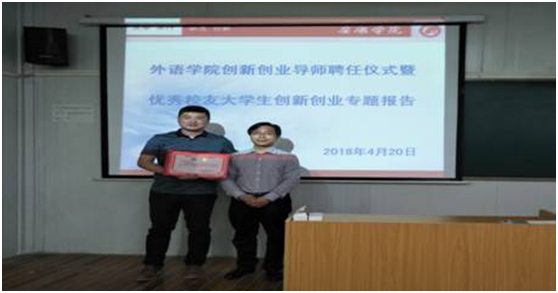 此次大学生创新创业教育活动共分两个阶段。首先,外语学院副院长张哲华致辞,简要介绍了石泉蒲公英培训学校与外语学院合作共建专业的基本情况,同时向参与活动的学生介绍了安康学院优秀创业校友、石泉蒲公英培训学校校长刘建强,为刘建强校友颁发了大学生创新创业校外导师聘书,他希望通过校友的引领,能够带动更多师生加入到创新创业的浪潮中来,以严谨、创新、务实的精神全心全意地投入到“双一流”建设中,为“双创”工作贡献新的力量。
