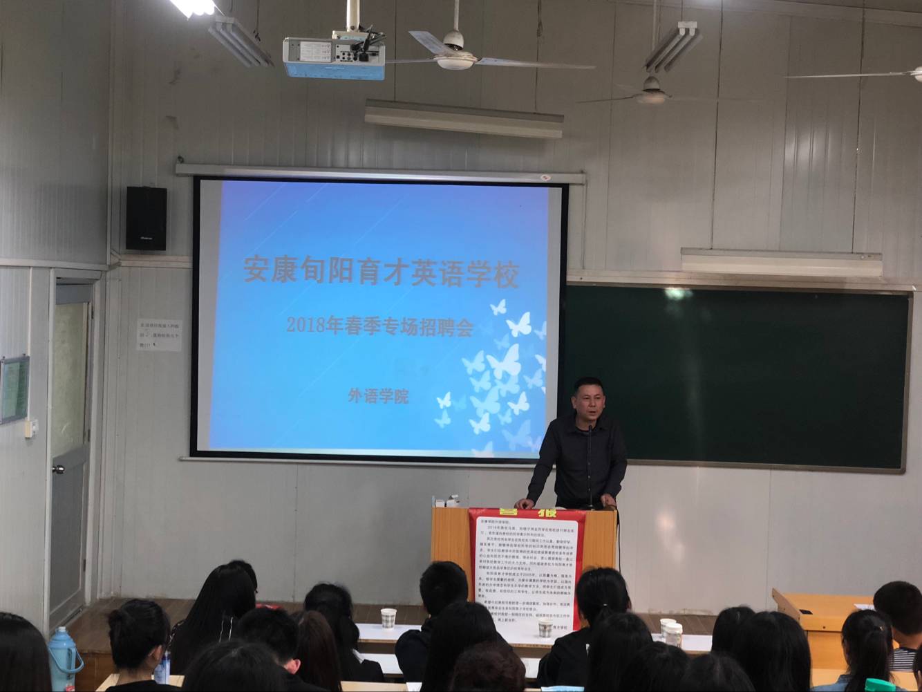 旬阳育才学校是经县教育局批准成立的专业文化培训学校,学校成立于2005年8月,学校现为全国外语学习研究会新课标英语培训基地,2008年、2013年被马承英语评为最佳成长基地校。招聘会上,赵辉校长强调学历不是当今用人的唯一标准,学生的自我认知要清晰、动手实践能力非常重要;作为一名未来的教师,要用一个温暖的灵魂去影响一个稚嫩的灵魂。招聘会上,赵辉校长介绍了旬阳育才学校招聘岗位和要求、福利待遇等,同时也对同学们面临的就业问题给予了一定指导。