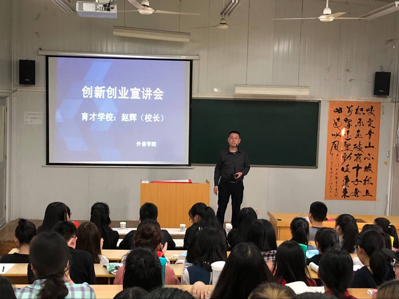 4月19日下午,在6号教学楼6407,旬阳育才学校校长赵辉应我院邀请为学生做创新创业报告。外语学院副院长张哲华、学工办主任郝礼军、辅导员常远红、2014级部分毕业生以及2017级全体学生参加了此次报告会。报告会由学工办主任郝礼军主持。
