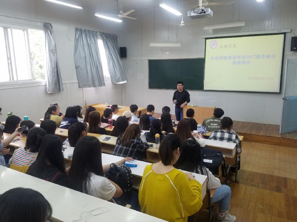 最后,张哲华副院长结合外语学院的专业建设和人才培养目标强调,专业方向没有好坏、难易之分,选择方向时切忌跟风,应从自身兴趣和志向出发,无论选择哪个方向,都需从现在做起,勤奋学习,提高各项专业技能,为未来职业技能学习奠定扎实基础。同时,他对英语专业2017级全体学生提出了要求,希望他们能够热爱自己选择的专业方向,锐意进取,为不断提升自身潜能和就业竞争力而努力。