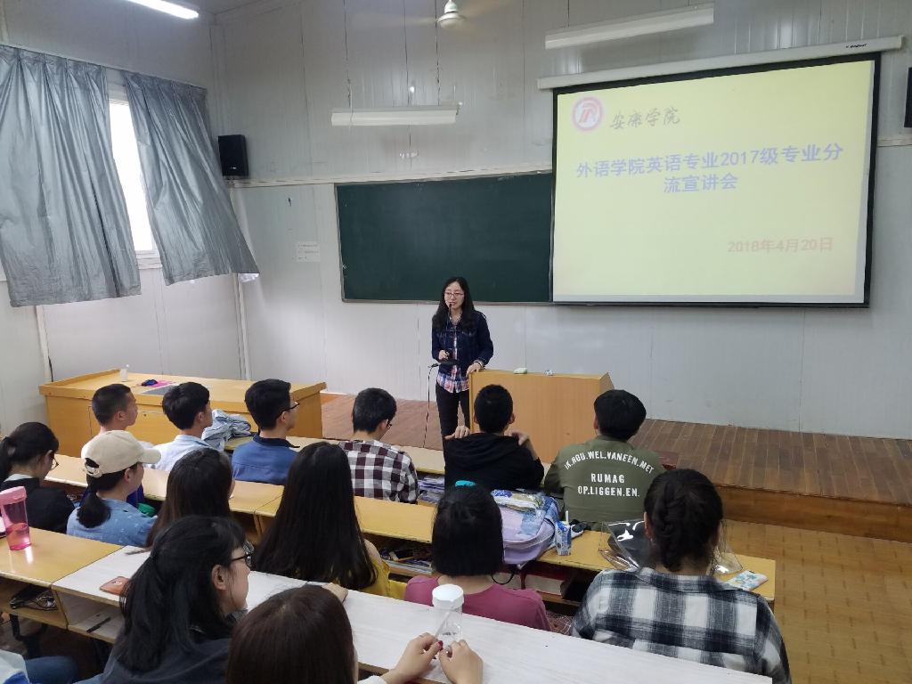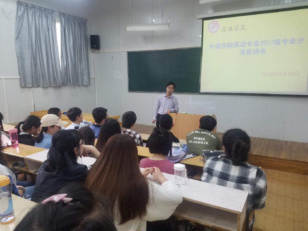 为适应应用型英语人才培养需要,针对学生专业发展与就业多元化需求,帮助学生明确对英语专业(职业)方向的认识,4月20日下午,外语学院在六号教学楼6407教室召开了英语专业2017级学生专业方向分流宣讲会。副院长张哲华、英语系主任赵龙、商务英语翻译团队教师陈蕾参加了会议。