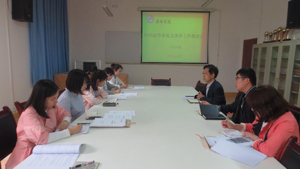 为了做好应用型人才培养工作,贯彻落实英语教师教育方向毕业论文改革方案,4月27日下午,我院在江南校区6109会议室召开了2018届毕业论文改革工作推进会,会议由副院长张哲华主持,论文改革小组指导教师姜国波、赵龙及参与本届毕业论文改革的全体学生。
