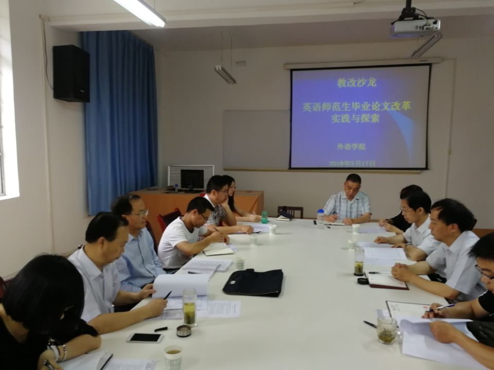 外语学院院长哈红光首先对学校首席专家、教务处领导莅临外语学院教改沙龙活动表示感谢,对外语学院英语师范生毕业论文改革的情况进行了总体概述。副院长张哲华对毕业论文改革的背景、目的原则、改革实施过程等方面进行了全面介绍。参会的外语学院专业教师针对本届毕业论文改革中的经验与教训进行了热烈讨论,并就有关做法进行了探讨。
