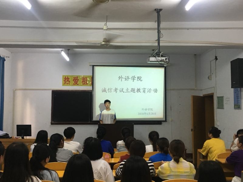 期末考试在即,为进一步严肃考风考纪,深入推进学风建设,营造良好的学习氛围,增强学生诚信意识,避免考试违纪现象发生,6月28日下午,外语学院各班开展诚信考试教育班会。